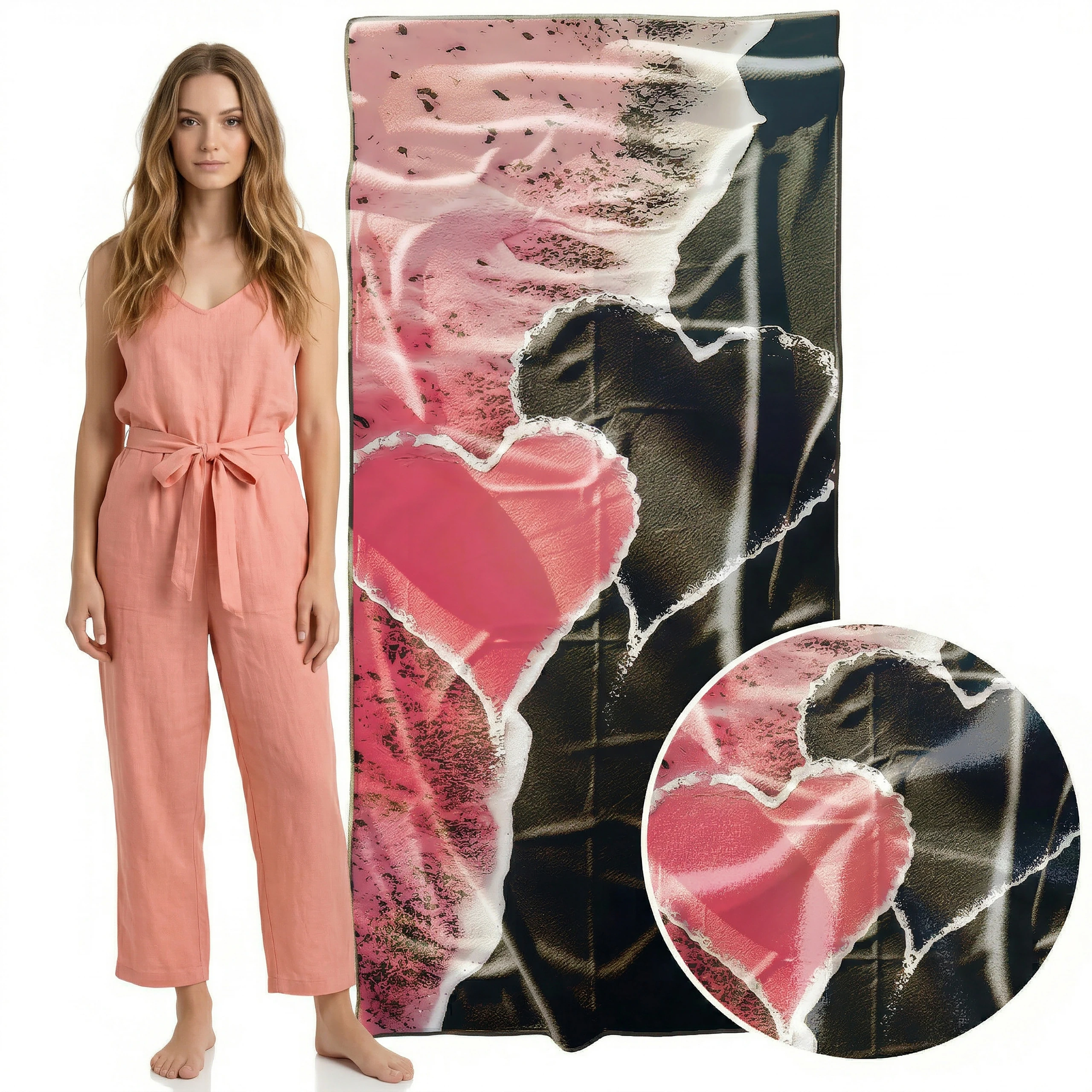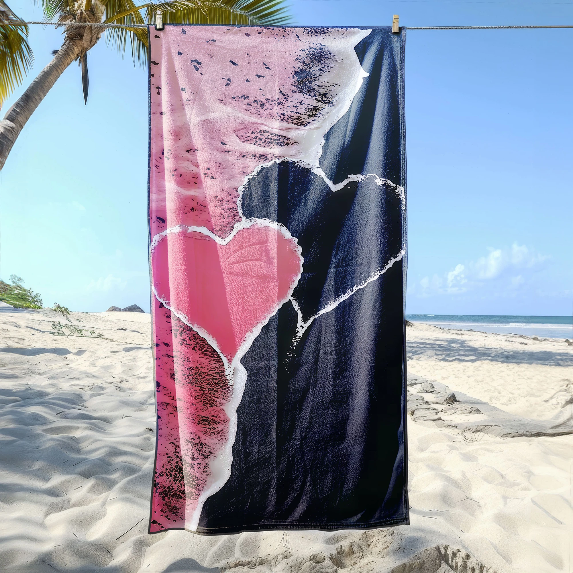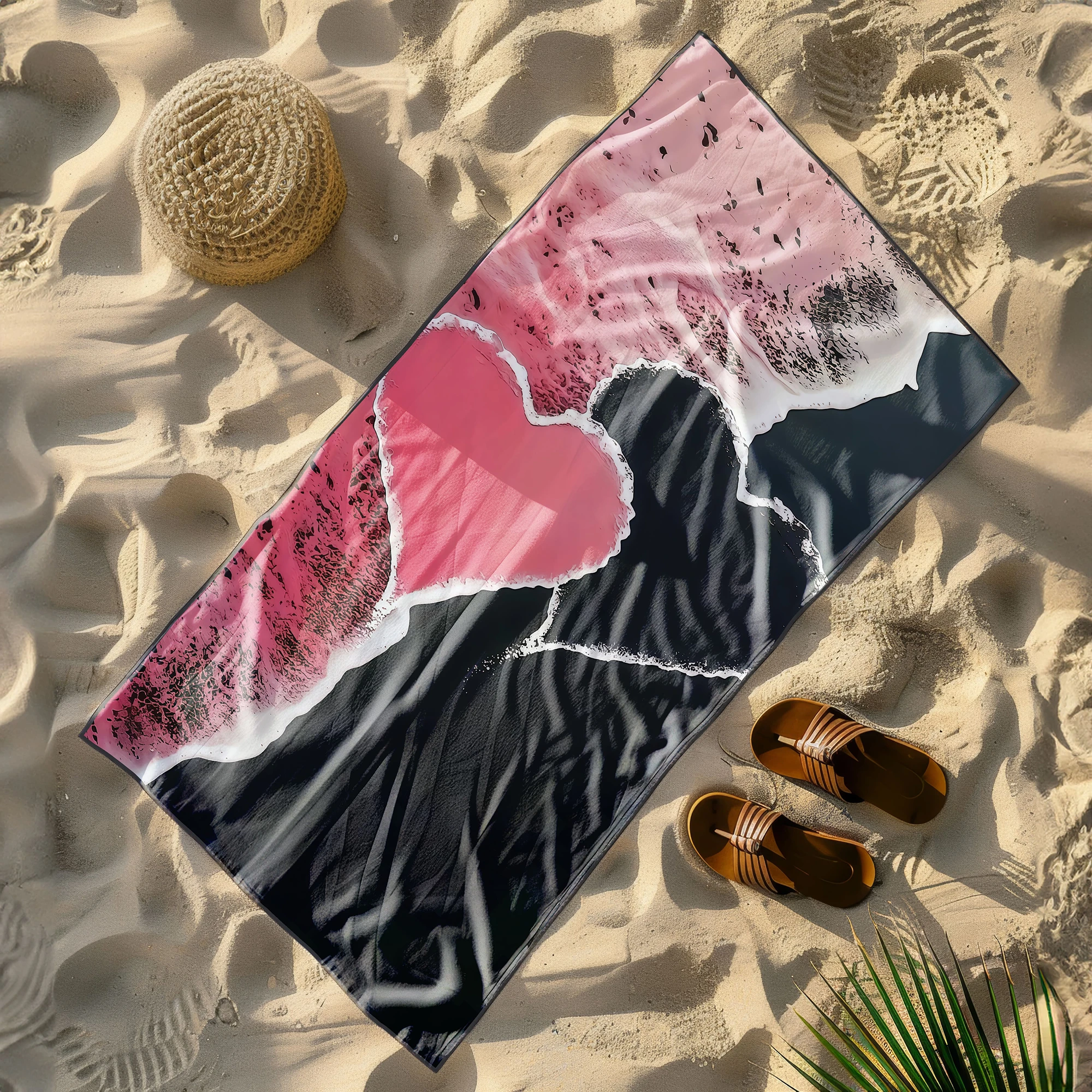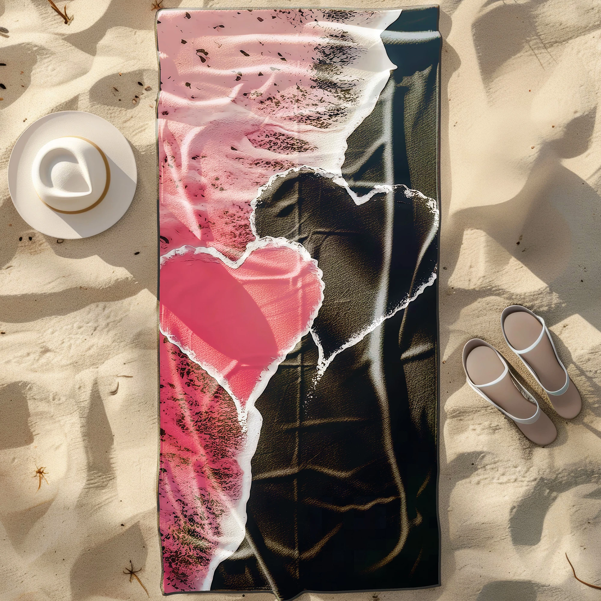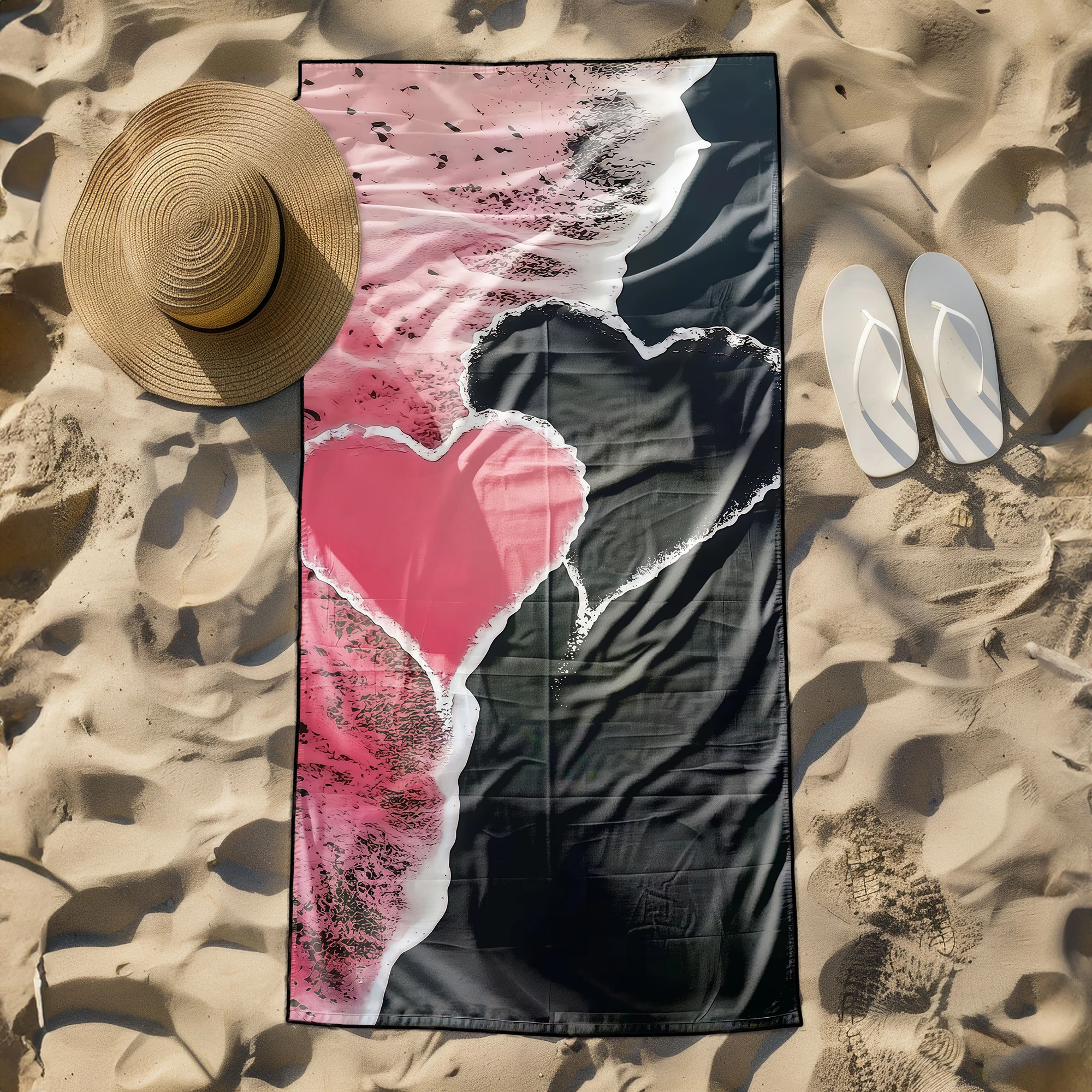 Otul się luksusowym komfortem i zachwyć wszystkich wokół nowoczesnym, romantycznym designem! 🖤 Ten duży ręcznik plażowy xxl z mikrofibry z elitarnej kolekcji SERENA wyróżnia się na tle innych. Wyraziste, różowo-czarne tło z niesamowitym efektem faktury formuje pośrodku przepiękny, abstrakcyjny kształt serca. To artystyczne dzieło w rozmiarze maksi to idealny wybór dla osób, które cenią gigantyczną wygodę oraz pragną połączyć romantyczny akcent z odważną, kontrastową estetyką podczas wypoczynku. ✨