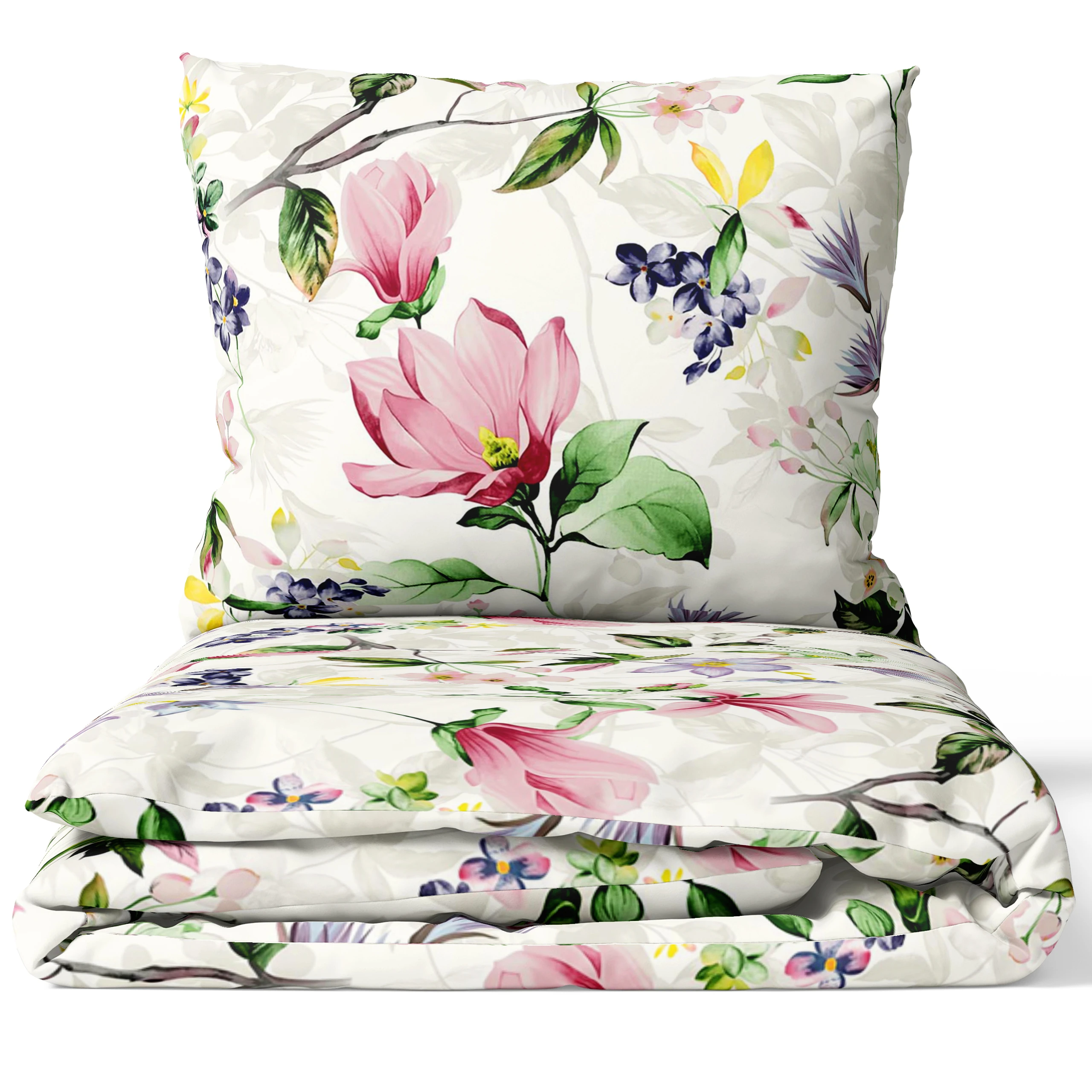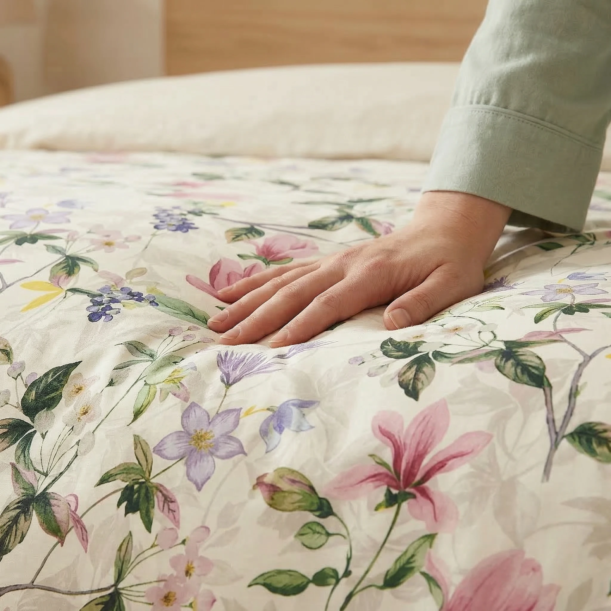 Odmień wnętrze swojej sypialni, wybierając ekskluzywną pościel bawełnianą w kwiaty 200x220 z urzekającej, pełnej wdzięku kolekcji "Kwiat Wiśni" 🌸. Ta dwuosobowa pościel premium to prawdziwe dzieło sztuki użytkowej, idealne do stworzenia jasnej, radosnej i niezwykle romantycznej przestrzeni. Subtelny, malarski motyw zachwyca kompozycją dużych, różowych kwiatów przypominających magnolię lub wiśnię, wplecionych w delikatne gałązki z drobnymi, fioletowymi kwiatuszkami 🌿 na nieskazitelnie jasnym tle. Duży rozmiar 200x220 cm wspaniale sprawdzi się na szerokich łóżkach małżeńskich, gwarantując najwyższy komfort i wprowadzając powiew wiosennej elegancji 🌙. To także niezwykle elegancki pomysł na prezent ślubny, rocznicowy czy na parapetówkę!