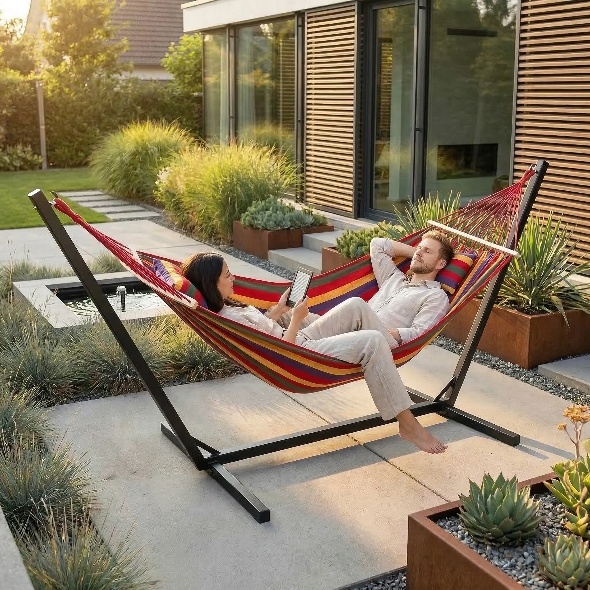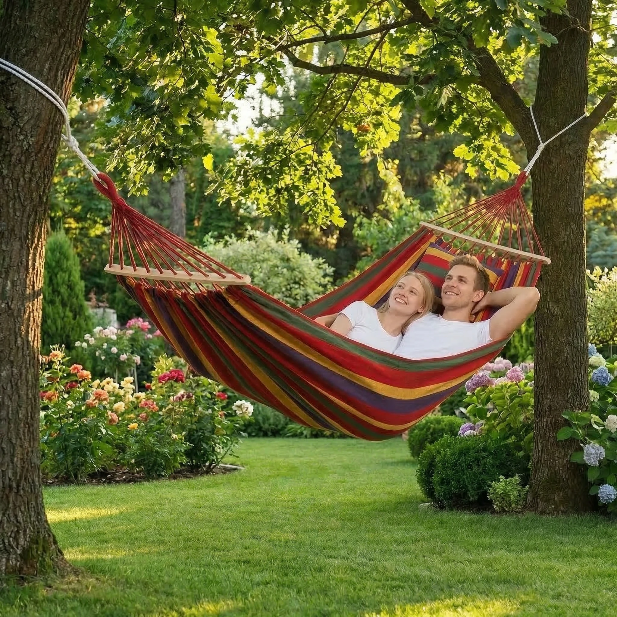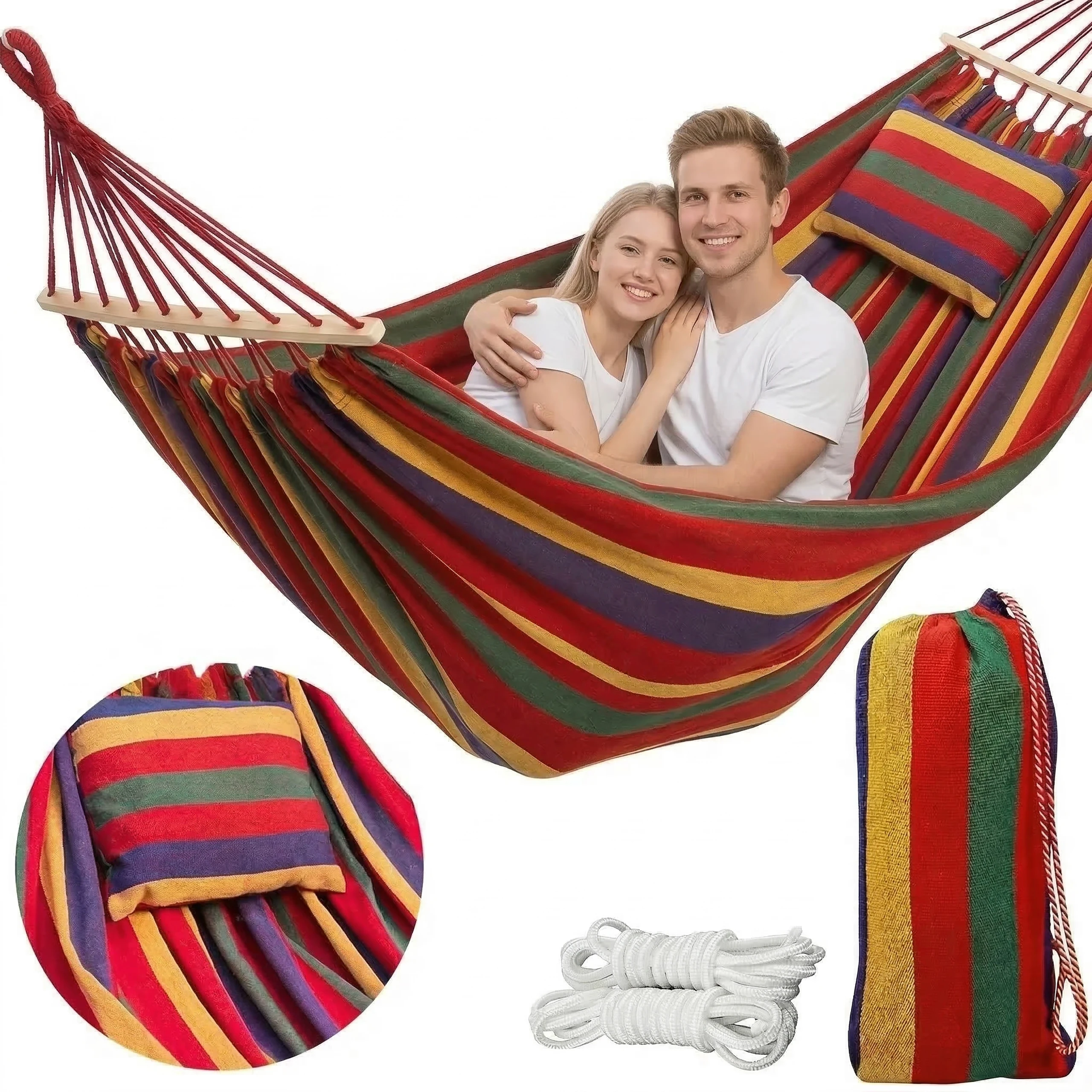 Zmień swój ogród, taras lub działkę w prawdziwą oazę spokoju! Pasiasty, duży hamak ogrodowy 2-osobowy w rozmiarze XXL w ciepłych, wielokolorowych barwach to gwarancja najwyższego komfortu na świeżym powietrzu. Ten model wyróżnia się absolutnym hitem – wbudowaną, miękką poduszką, która idealnie podpiera głowę i kark podczas popołudniowej drzemki czy czytania książki. To perfekcyjny hamak na balkon oraz wygodny hamak turystyczny na letnie wyjazdy! 🌳☀️