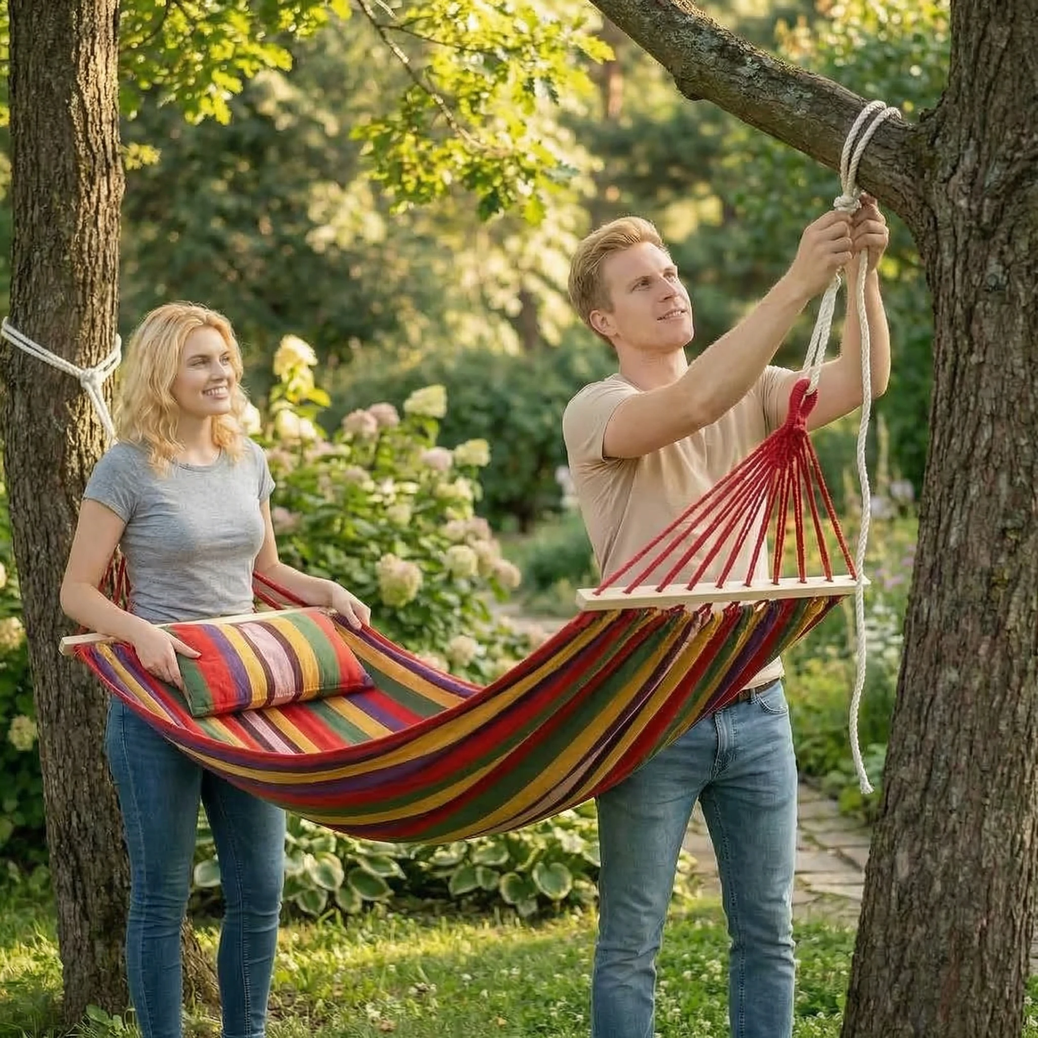 Poduszka w zestawie i ekstremalna wytrzymałość ☁️💪 Oprócz dodatkowego komfortu w postaci poduszki, zadbaliśmy o niezawodność. Nasz mocny hamak został uszyty z wysokogatunkowego, oddychającego płótna, będącego idealną mieszanką bawełny i poliestru. Takie połączenie gwarantuje optymalną cyrkulację powietrza oraz niesamowitą odporność na rozdarcia. Grube liny o specjalnym splocie sprawiają, że konstrukcja wytrzymuje obciążenie aż do 199 kg, oferując w 100% bezpieczny relaks dla dwóch osób. 👫