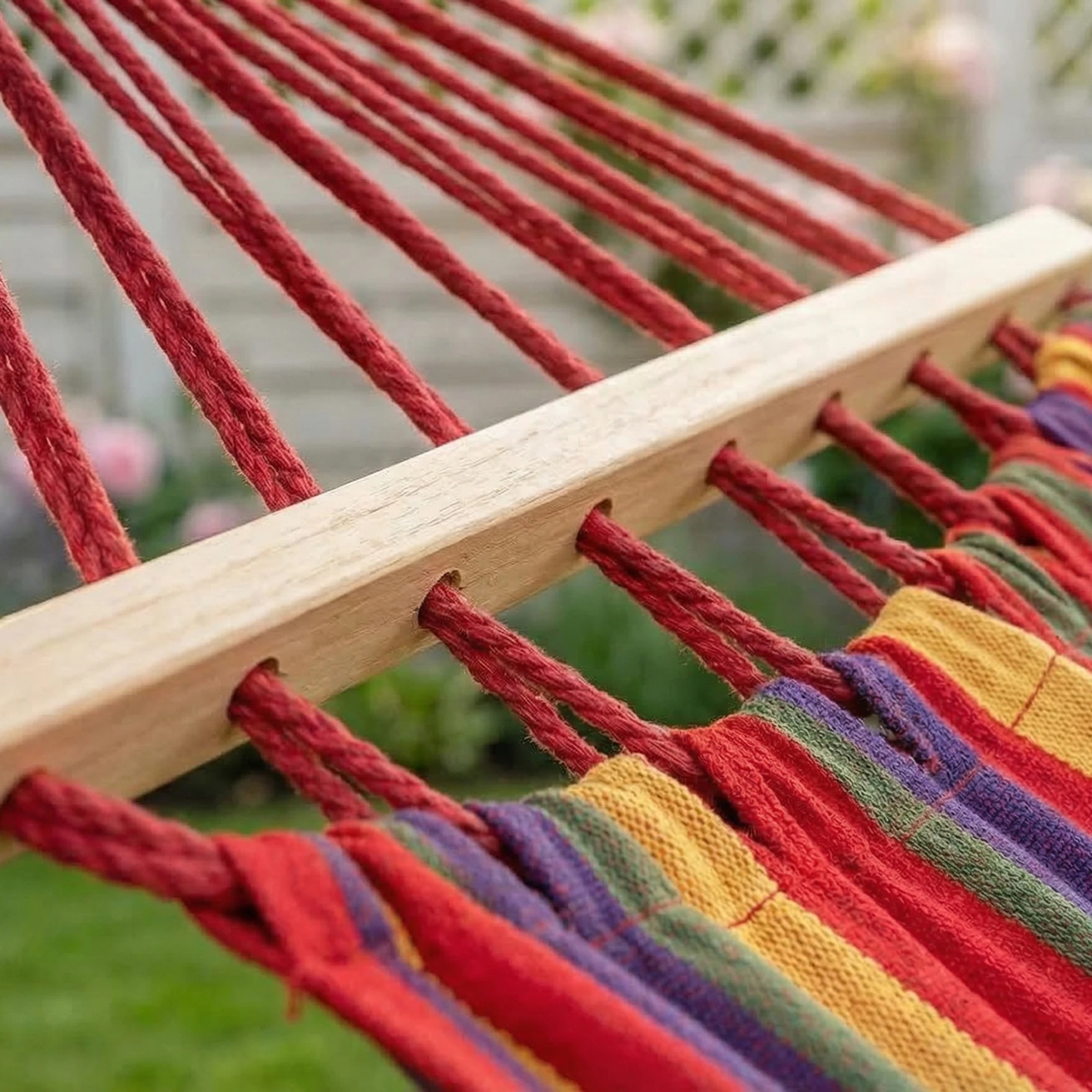 W zestawie: Hamak, drewniane poprzeczki, miękka poduszka, pokrowiec/torba, linki montażowe