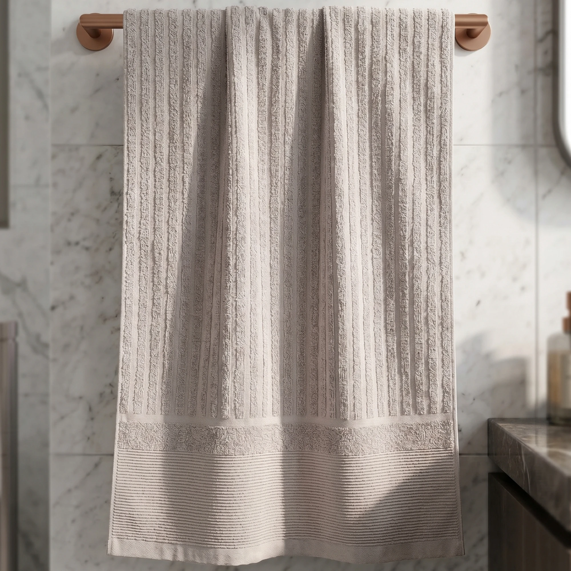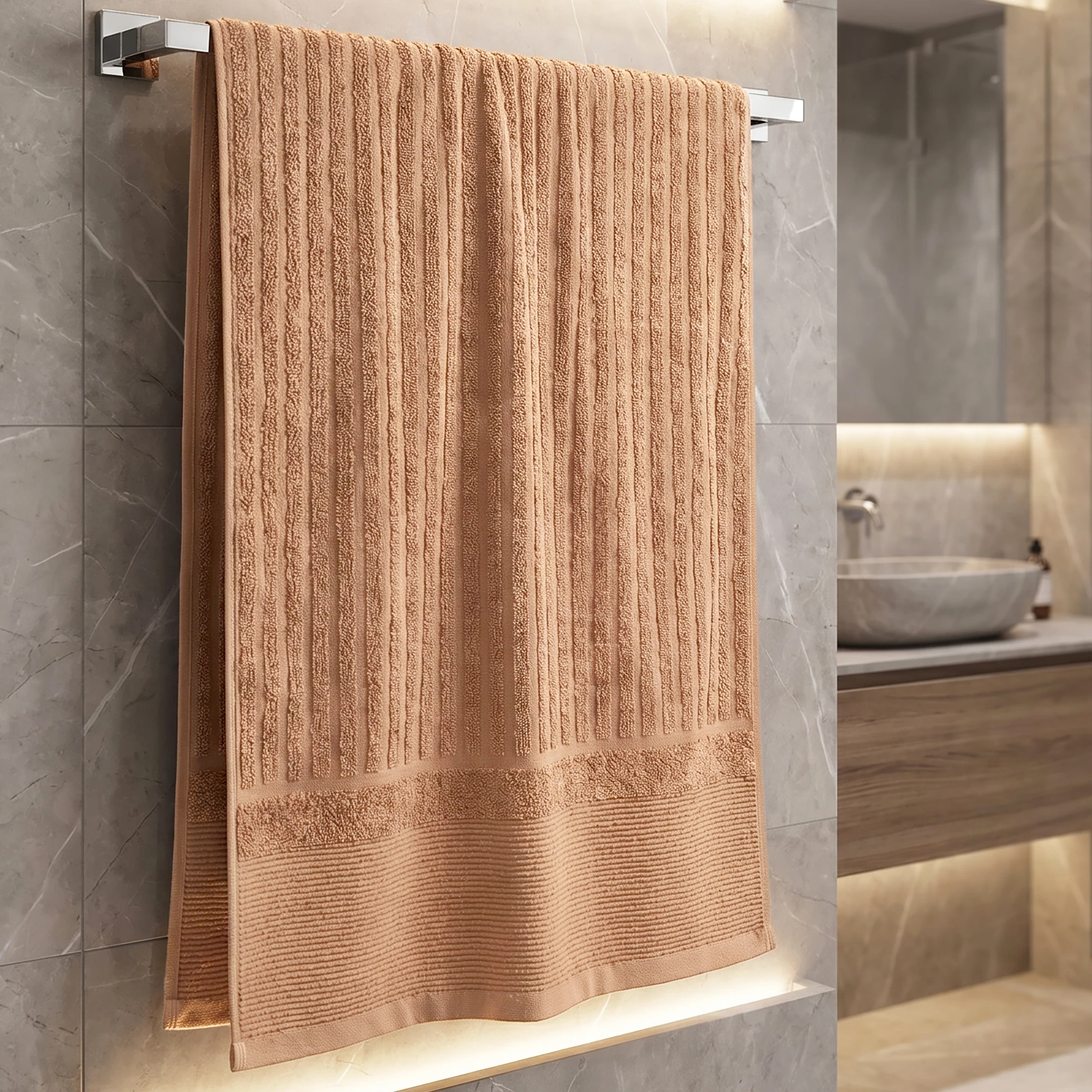 💧 Błyskawiczne Schnięcie po Umyciu Rąk: Ręczniki przy umywalce są używane dziesiątki razy dziennie. Prążkowana faktura sprawia, że powietrze swobodnie przepływa między włóknami. Dzięki temu bawełna błyskawicznie schnie, co zapobiega namnażaniu się bakterii i powstawaniu stęchłego zapachu.