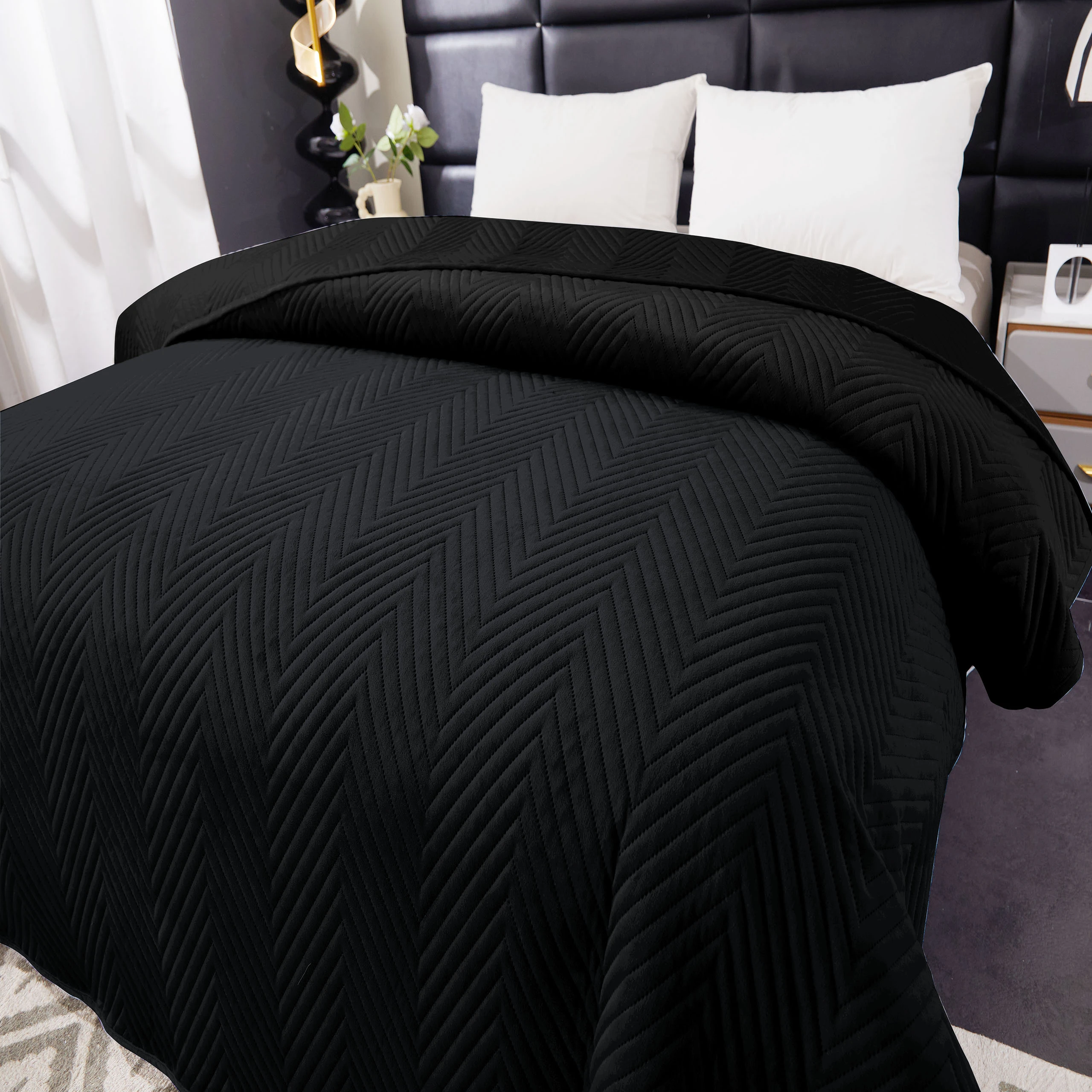 Wysokiej jakości narzuta na łóżko o wymiarach 200x220 cm to połączenie elegancji, funkcjonalności i wyjątkowego komfortu. Wykonana z luksusowego weluru, zachwyca swoją miękkością i przyjemnym w dotyku wykończeniem, które dodaje wnętrzu przytulności. Stylowy, subtelny wzór podkreśla nowoczesny charakter narzuty, dzięki czemu doskonale komponuje się zarówno z klasycznymi, jak i nowoczesnymi aranżacjami sypialni.