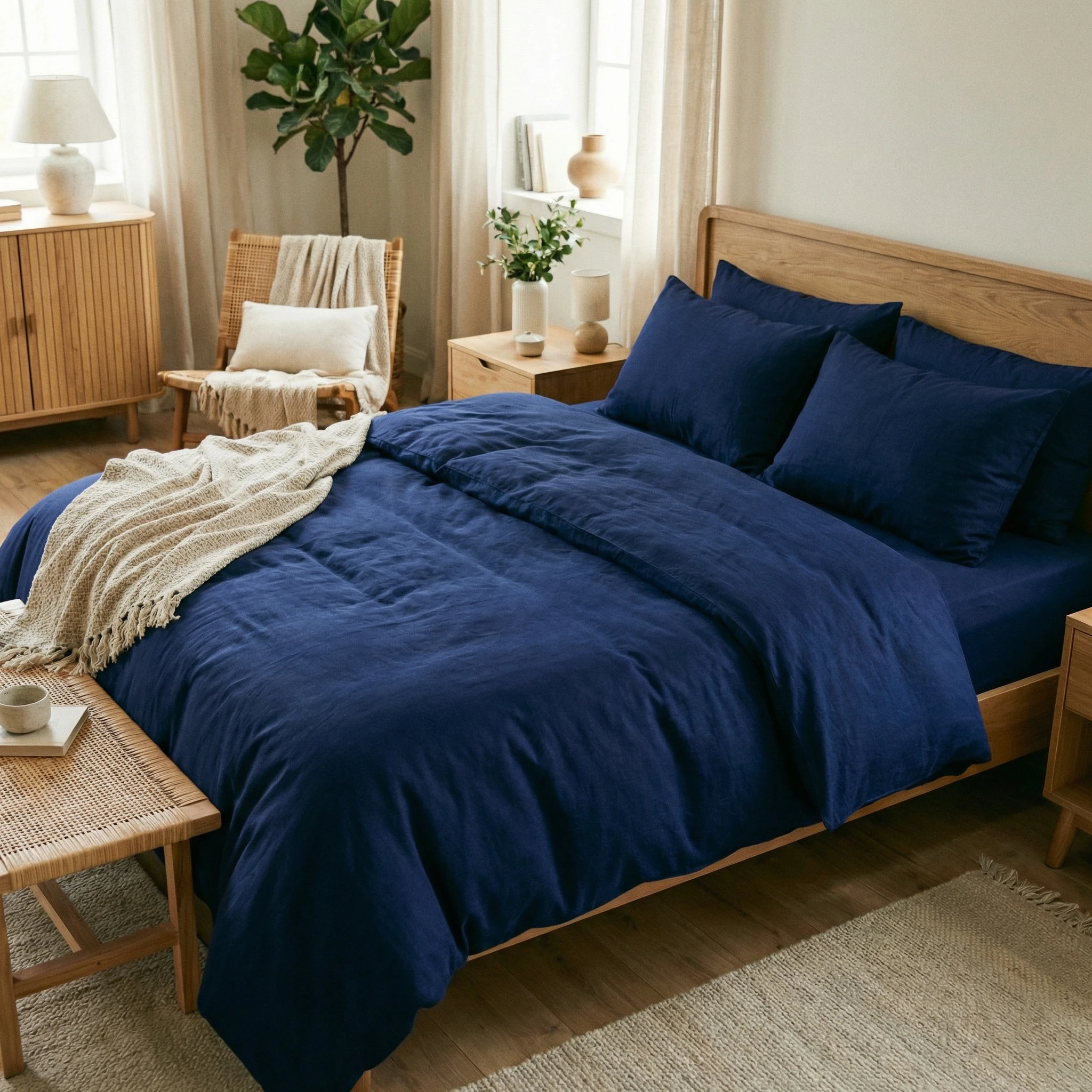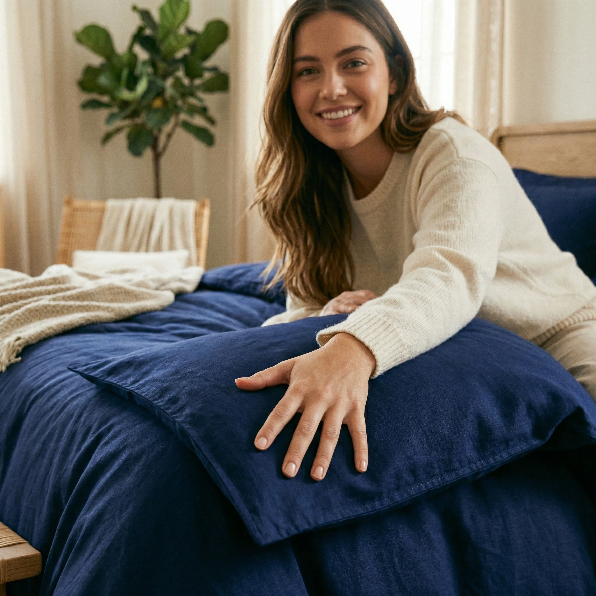 Zalecamy pranie w temperaturze 40°C, zawsze z zasuniętymi suwakami. Używanie delikatnych detergentów dedykowanych do ciemnych kolorów zabezpieczy głęboki, granatowy odcień pościeli przed spieraniem i pozwoli zachować jej wyrazisty, elegancki charakter na lata.