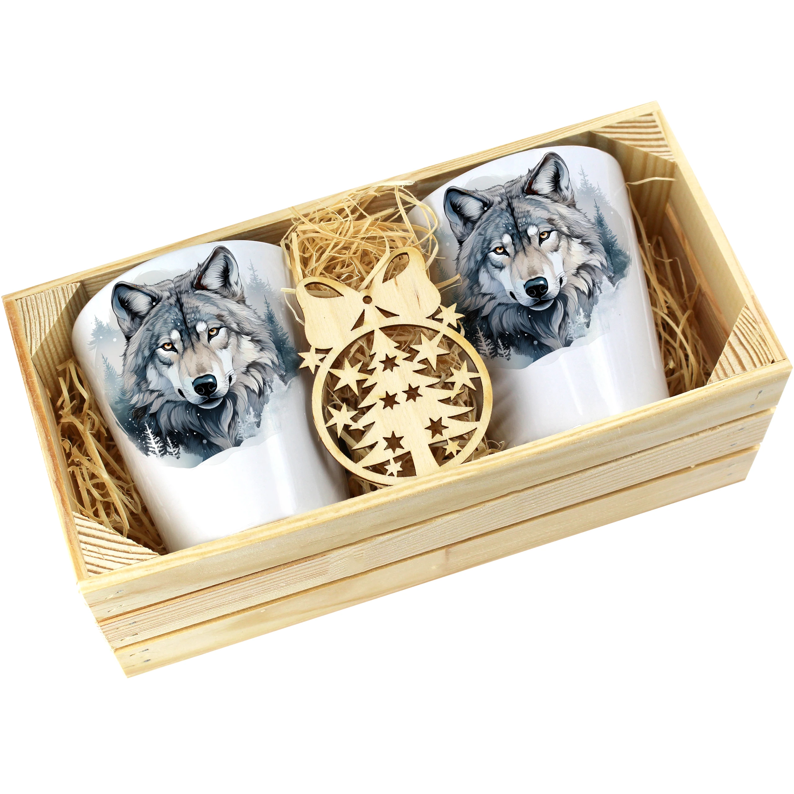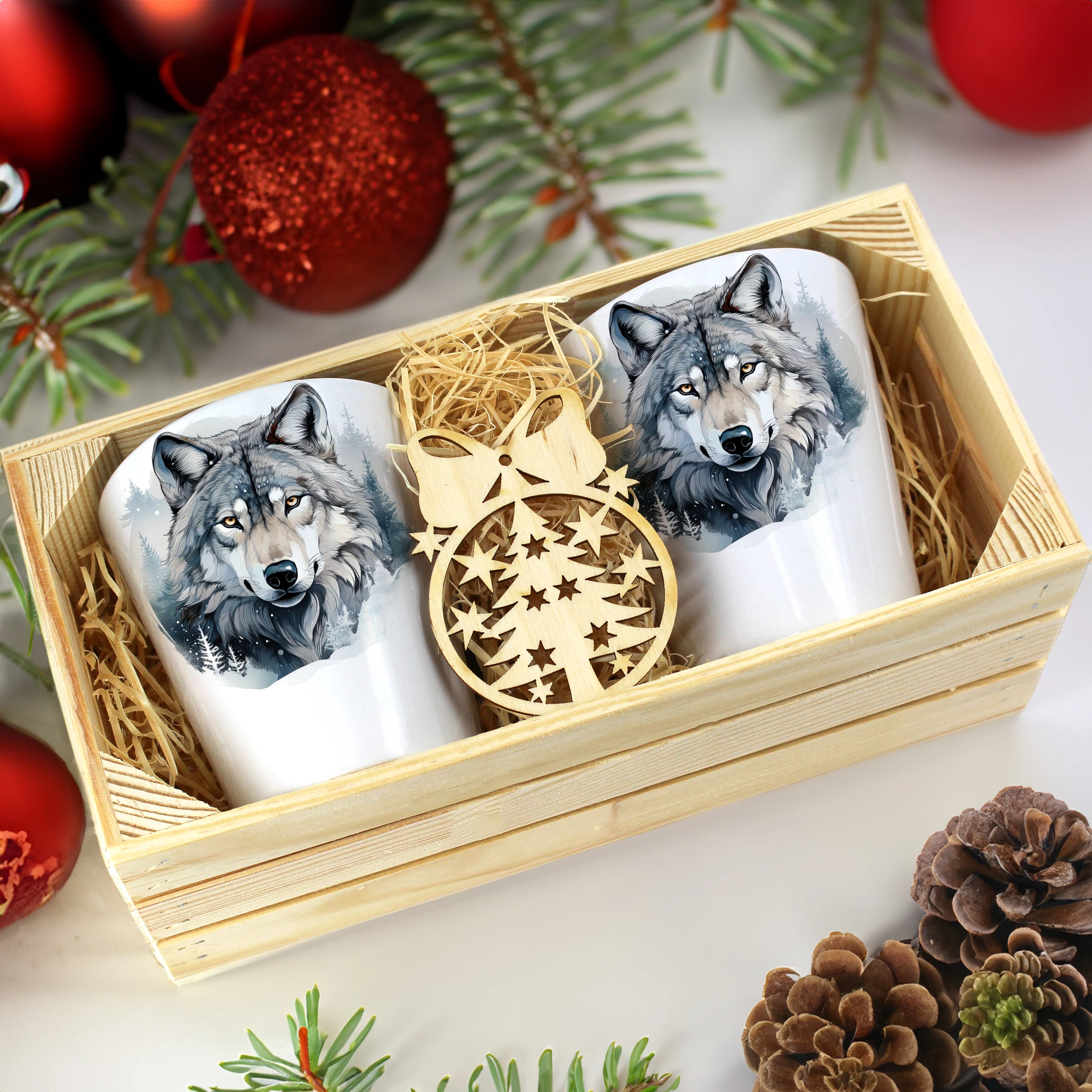 Zestaw składa się z dwóch kubków latte, które są starannie zapakowane w elegancką drewnianą skrzyneczkę. Dodatkowo, do każdego zestawu dołączona jest drewniana bombka, co czyni go idealnym prezentem na święta, urodziny czy inne specjalne okazje. Kubki zostały zaprojektowane, nadrukowane i pakowane w naszej pracowni, co zapewnia ich oryginalność oraz wysoką jakość.