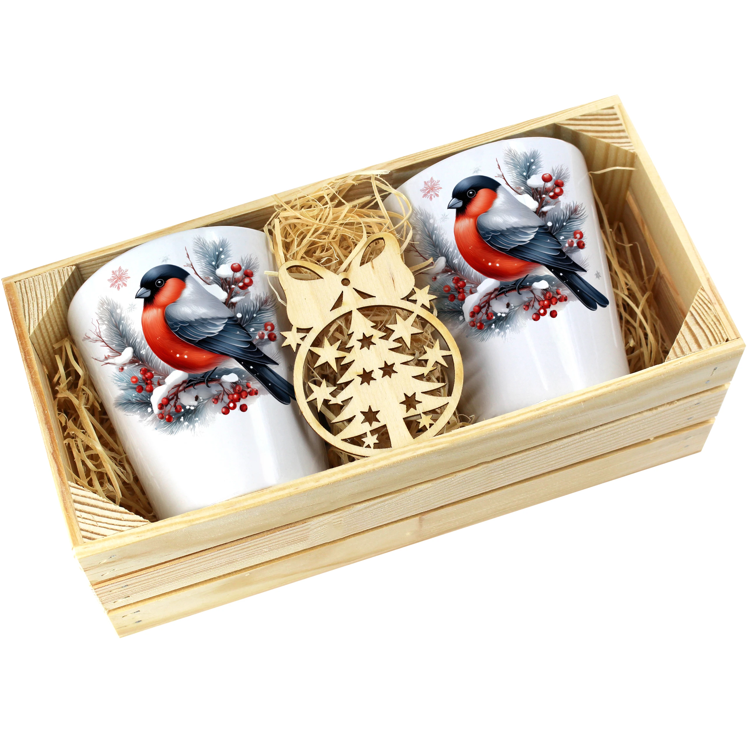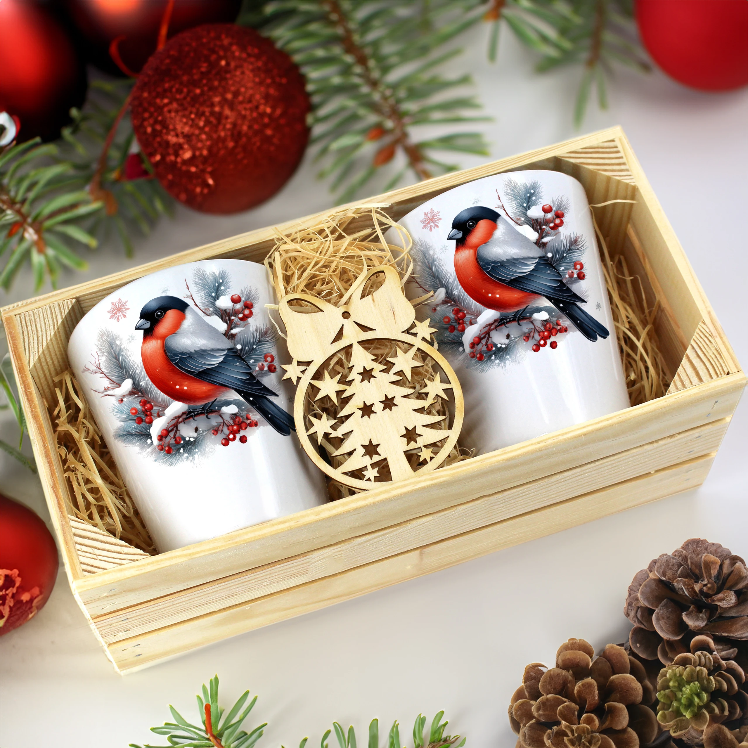Zestaw składa się z dwóch kubków latte, które są starannie zapakowane w elegancką drewnianą skrzyneczkę. Dodatkowo, do każdego zestawu dołączona jest drewniana bombka, co czyni go idealnym prezentem na święta, urodziny czy inne specjalne okazje. Kubki zostały zaprojektowane, nadrukowane i pakowane w naszej pracowni, co zapewnia ich oryginalność oraz wysoką jakość.