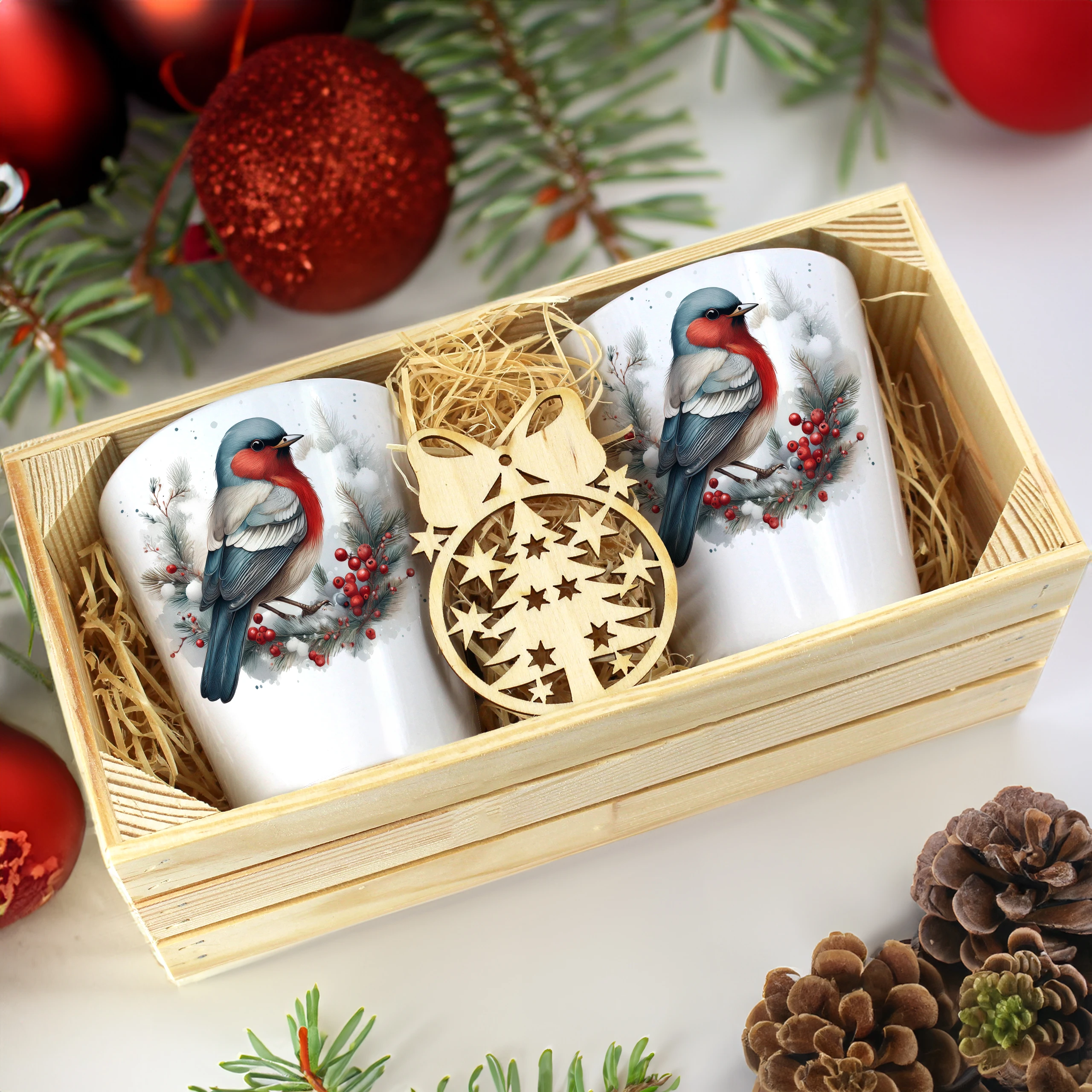 Zestaw składa się z dwóch kubków latte, które są starannie zapakowane w elegancką drewnianą skrzyneczkę. Dodatkowo, do każdego zestawu dołączona jest drewniana bombka, co czyni go idealnym prezentem na święta, urodziny czy inne specjalne okazje. Kubki zostały zaprojektowane, nadrukowane i pakowane w naszej pracowni, co zapewnia ich oryginalność oraz wysoką jakość.