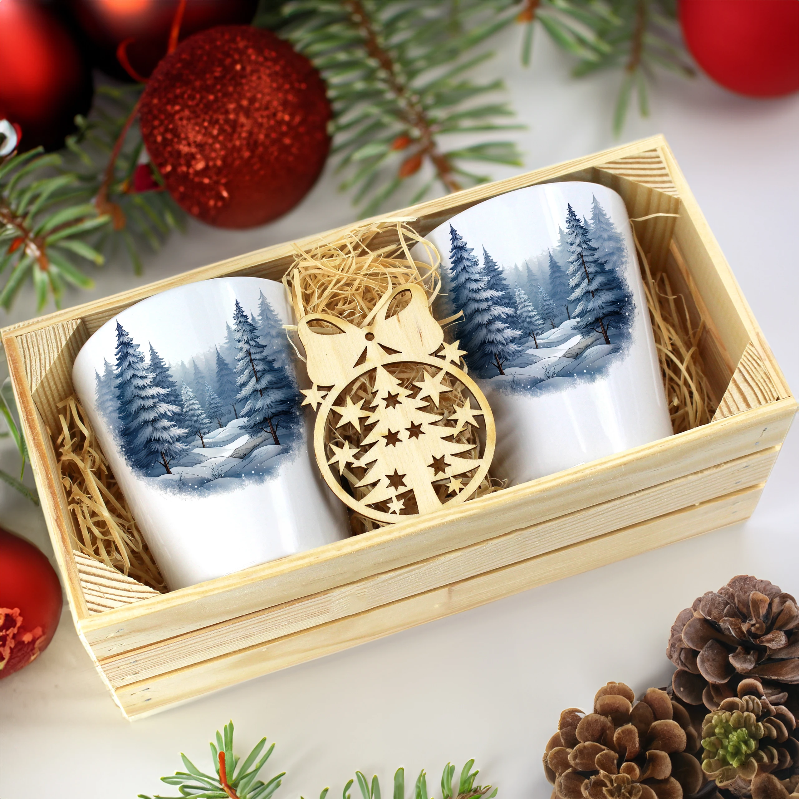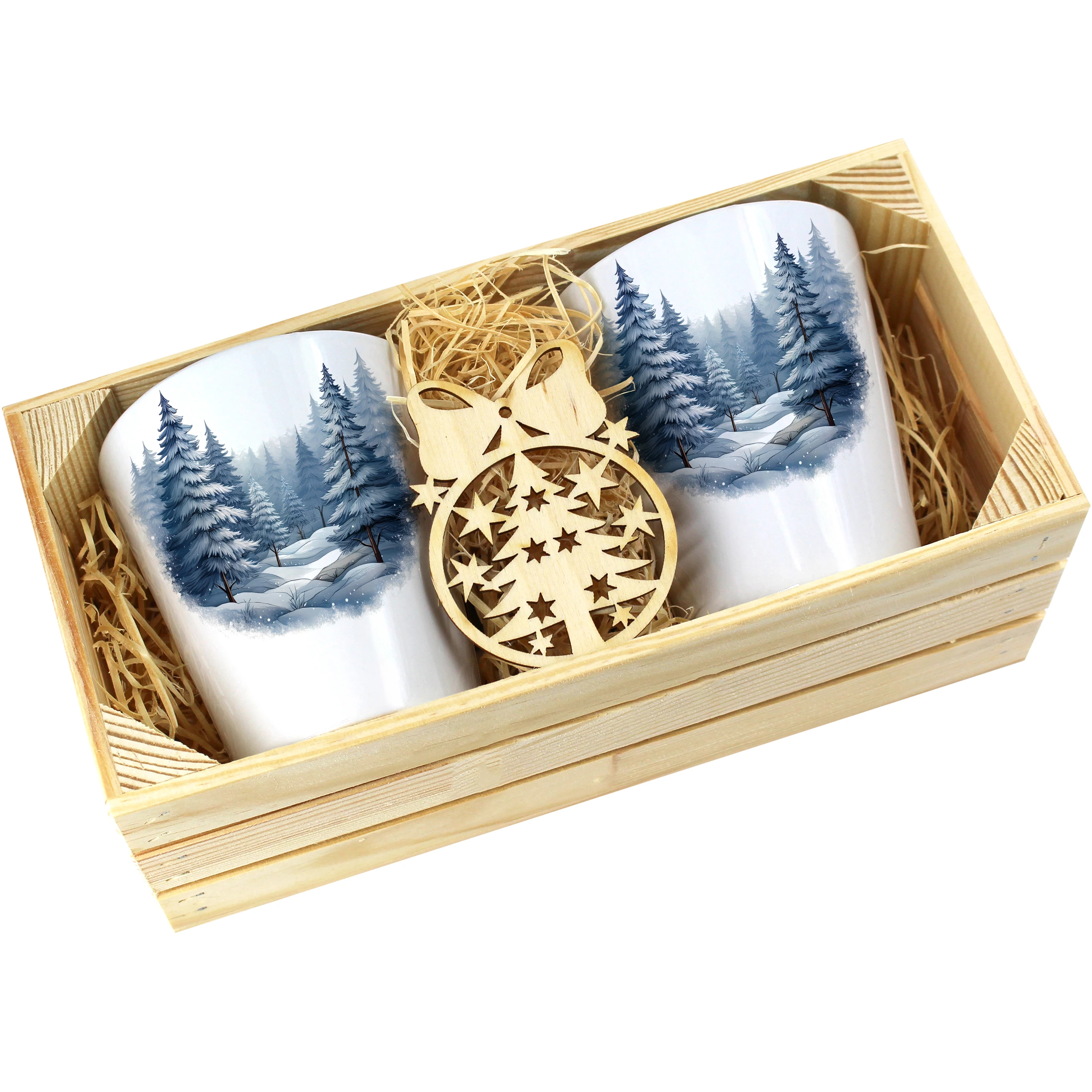 Zestaw składa się z dwóch kubków latte, które są starannie zapakowane w elegancką drewnianą skrzyneczkę. Dodatkowo, do każdego zestawu dołączona jest drewniana bombka, co czyni go idealnym prezentem na święta, urodziny czy inne specjalne okazje. Kubki zostały zaprojektowane, nadrukowane i pakowane w naszej pracowni, co zapewnia ich oryginalność oraz wysoką jakość.