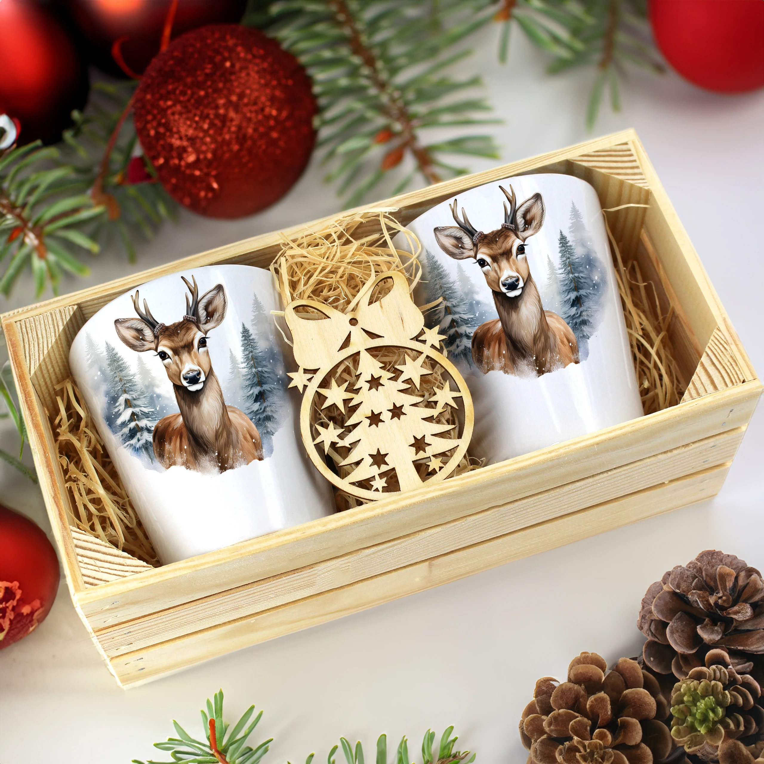 Zestaw składa się z dwóch kubków latte, które są starannie zapakowane w elegancką drewnianą skrzyneczkę. Dodatkowo, do każdego zestawu dołączona jest drewniana bombka, co czyni go idealnym prezentem na święta, urodziny czy inne specjalne okazje. Kubki zostały zaprojektowane, nadrukowane i pakowane w naszej pracowni, co zapewnia ich oryginalność oraz wysoką jakość.