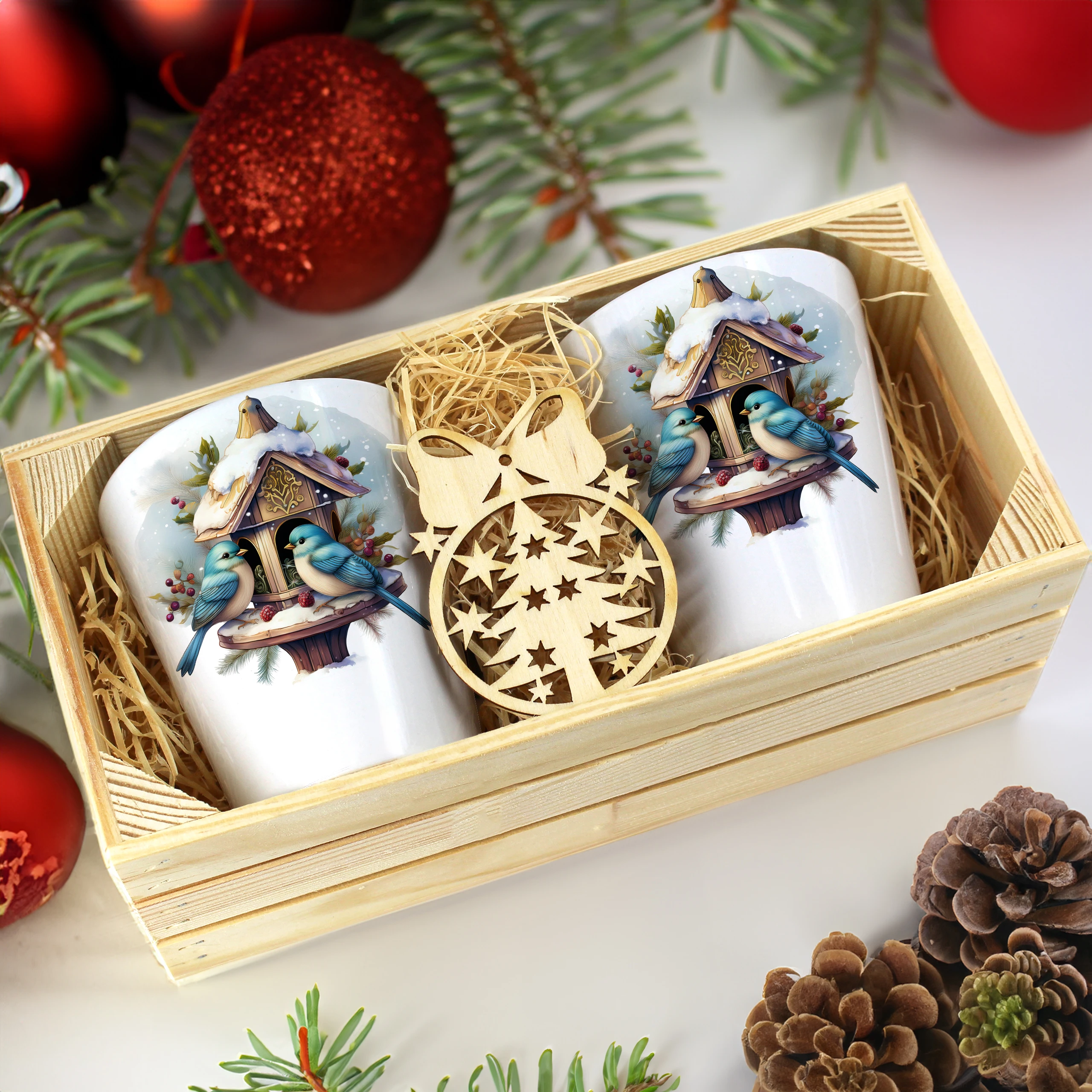 Zestaw składa się z dwóch kubków latte, które są starannie zapakowane w elegancką drewnianą skrzyneczkę. Dodatkowo, do każdego zestawu dołączona jest drewniana bombka, co czyni go idealnym prezentem na święta, urodziny czy inne specjalne okazje. Kubki zostały zaprojektowane, nadrukowane i pakowane w naszej pracowni, co zapewnia ich oryginalność oraz wysoką jakość.