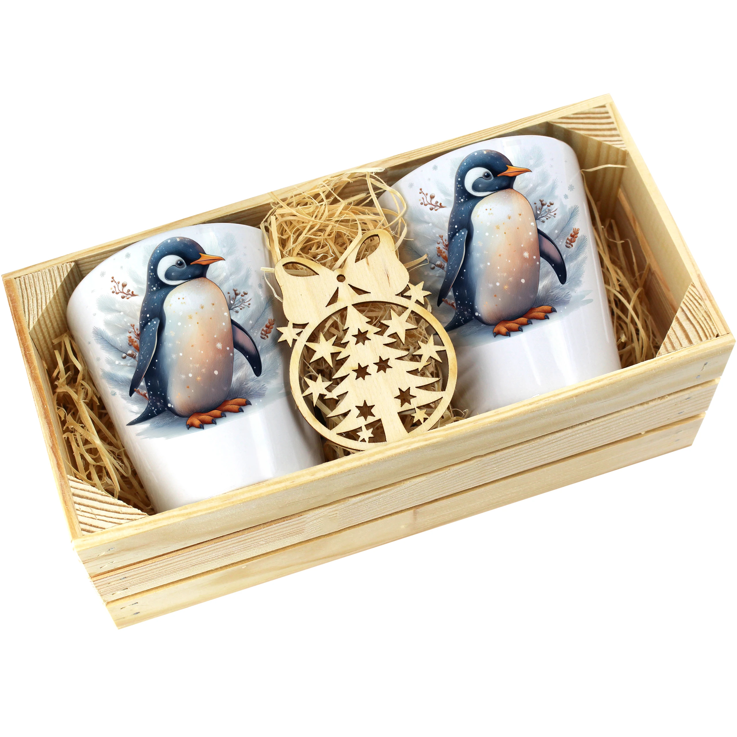 Zestaw składa się z dwóch kubków latte, które są starannie zapakowane w elegancką drewnianą skrzyneczkę. Dodatkowo, do każdego zestawu dołączona jest drewniana bombka, co czyni go idealnym prezentem na święta, urodziny czy inne specjalne okazje. Kubki zostały zaprojektowane, nadrukowane i pakowane w naszej pracowni, co zapewnia ich oryginalność oraz wysoką jakość.