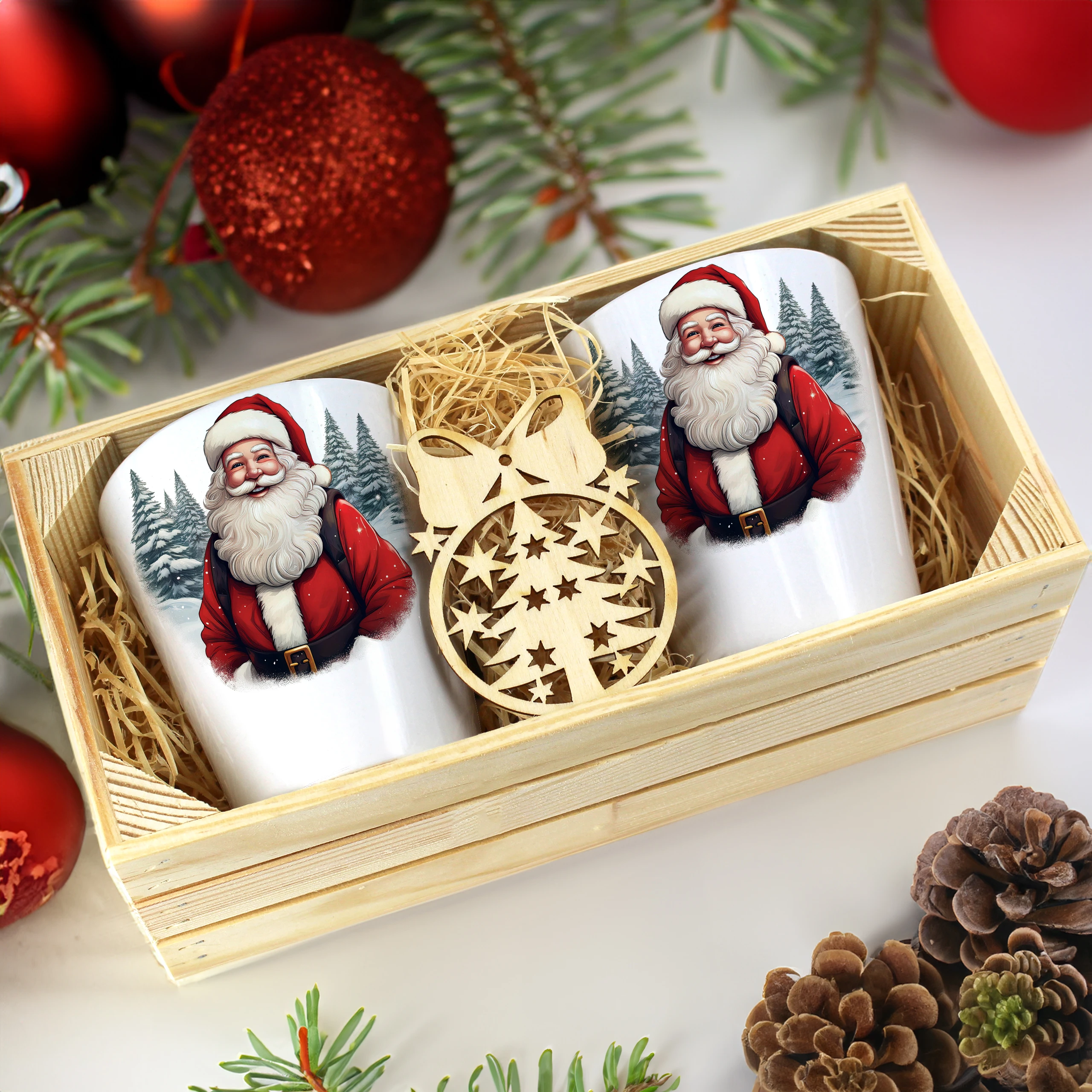 Zestaw składa się z dwóch kubków latte, które są starannie zapakowane w elegancką drewnianą skrzyneczkę. Dodatkowo, do każdego zestawu dołączona jest drewniana bombka, co czyni go idealnym prezentem na święta, urodziny czy inne specjalne okazje. Kubki zostały zaprojektowane, nadrukowane i pakowane w naszej pracowni, co zapewnia ich oryginalność oraz wysoką jakość.