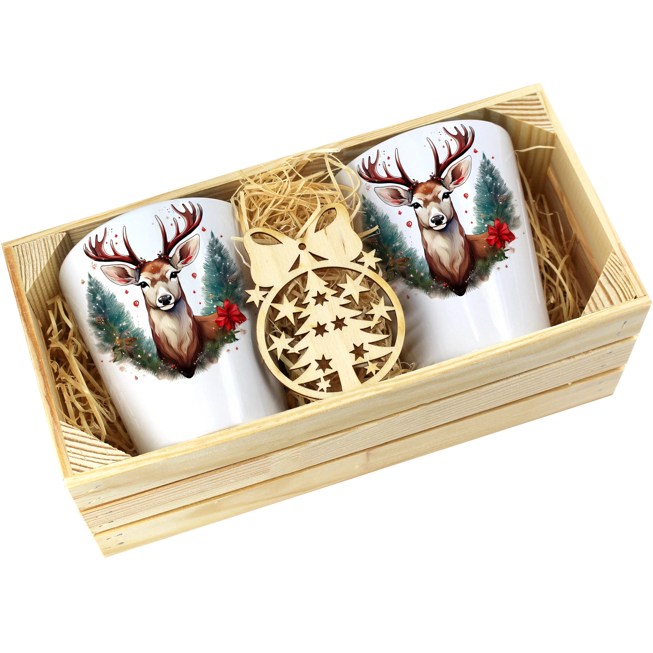Zestaw składa się z dwóch kubków latte, które są starannie zapakowane w elegancką drewnianą skrzyneczkę. Dodatkowo, do każdego zestawu dołączona jest drewniana bombka, co czyni go idealnym prezentem na święta, urodziny czy inne specjalne okazje. Kubki zostały zaprojektowane, nadrukowane i pakowane w naszej pracowni, co zapewnia ich oryginalność oraz wysoką jakość.