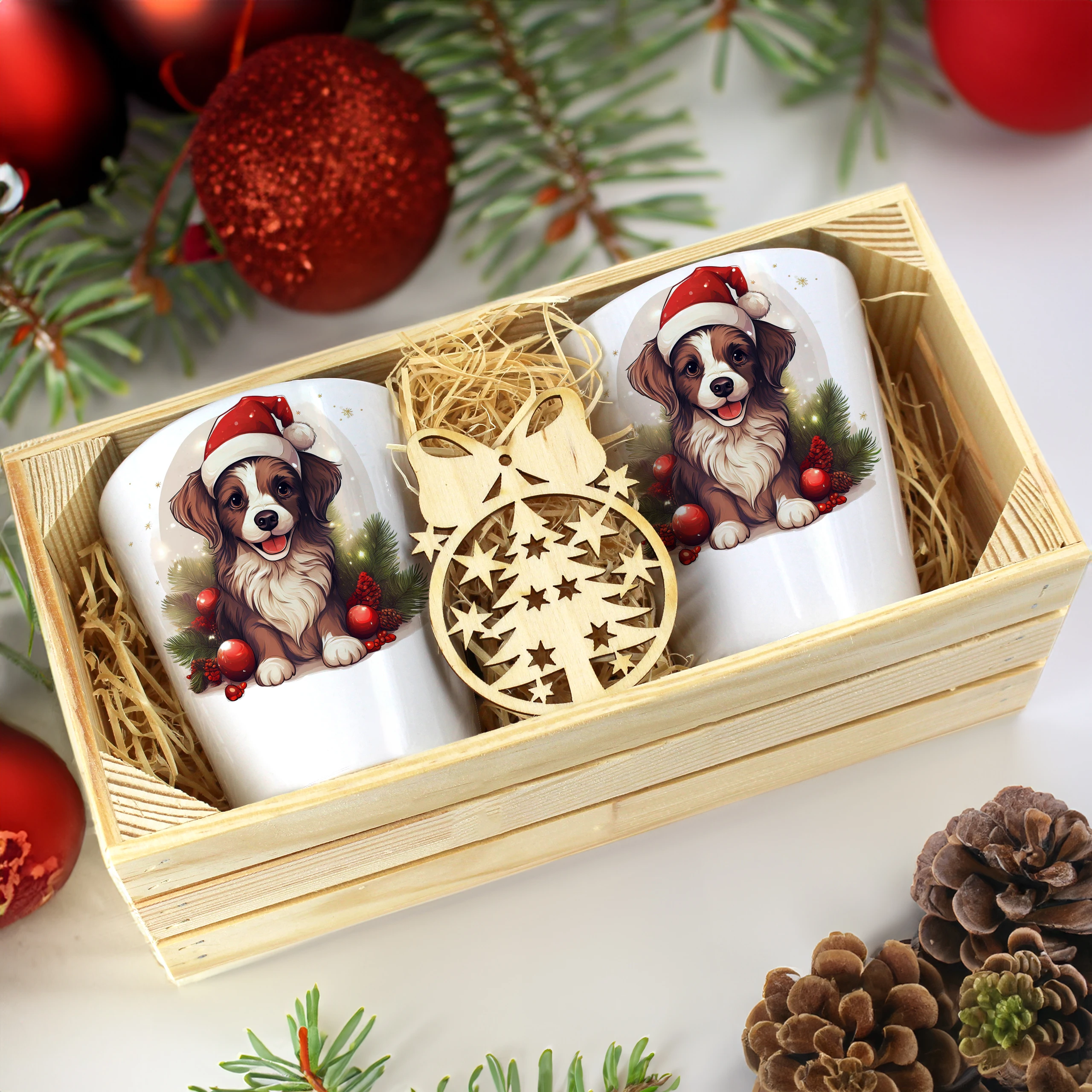 Zestaw składa się z dwóch kubków latte, które są starannie zapakowane w elegancką drewnianą skrzyneczkę. Dodatkowo, do każdego zestawu dołączona jest drewniana bombka, co czyni go idealnym prezentem na święta, urodziny czy inne specjalne okazje. Kubki zostały zaprojektowane, nadrukowane i pakowane w naszej pracowni, co zapewnia ich oryginalność oraz wysoką jakość.