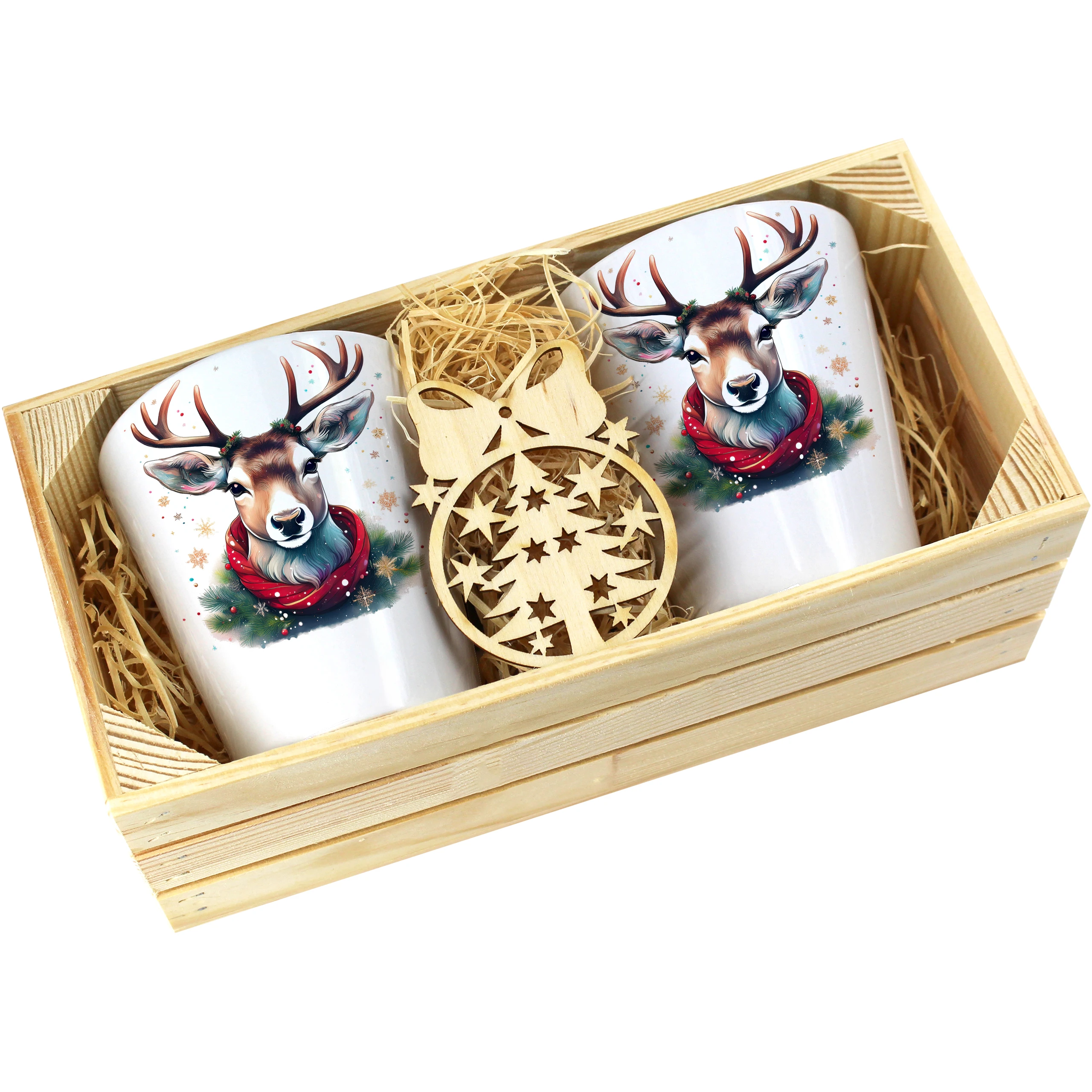 Zestaw składa się z dwóch kubków latte, które są starannie zapakowane w elegancką drewnianą skrzyneczkę. Dodatkowo, do każdego zestawu dołączona jest drewniana bombka, co czyni go idealnym prezentem na święta, urodziny czy inne specjalne okazje. Kubki zostały zaprojektowane, nadrukowane i pakowane w naszej pracowni, co zapewnia ich oryginalność oraz wysoką jakość.