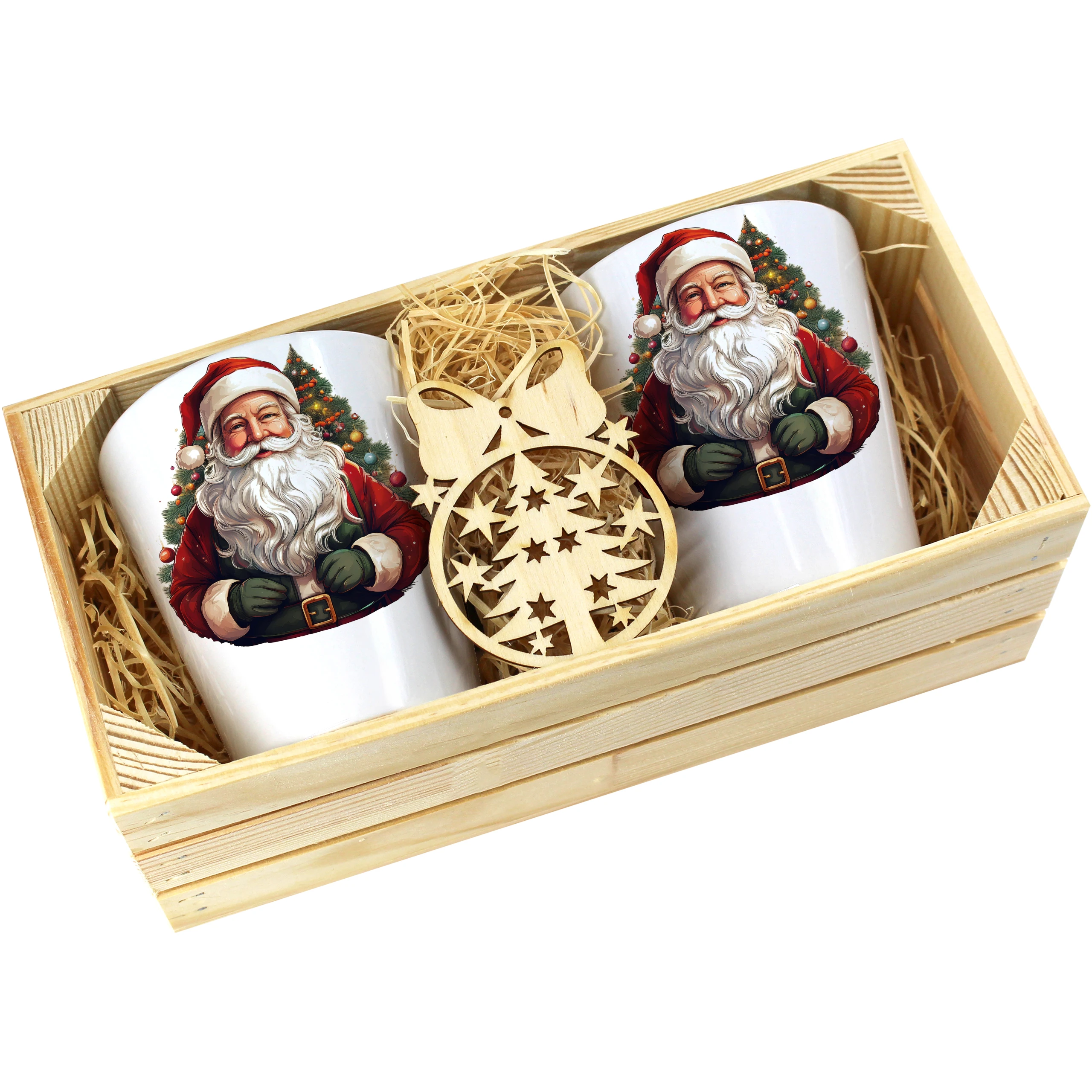 Zestaw składa się z dwóch kubków latte, które są starannie zapakowane w elegancką drewnianą skrzyneczkę. Dodatkowo, do każdego zestawu dołączona jest drewniana bombka, co czyni go idealnym prezentem na święta, urodziny czy inne specjalne okazje. Kubki zostały zaprojektowane, nadrukowane i pakowane w naszej pracowni, co zapewnia ich oryginalność oraz wysoką jakość.