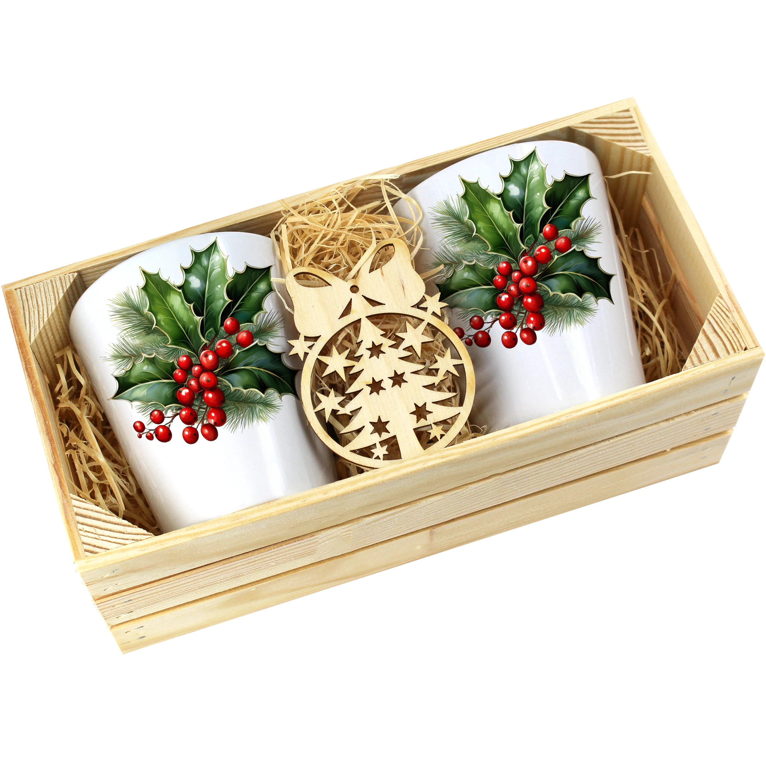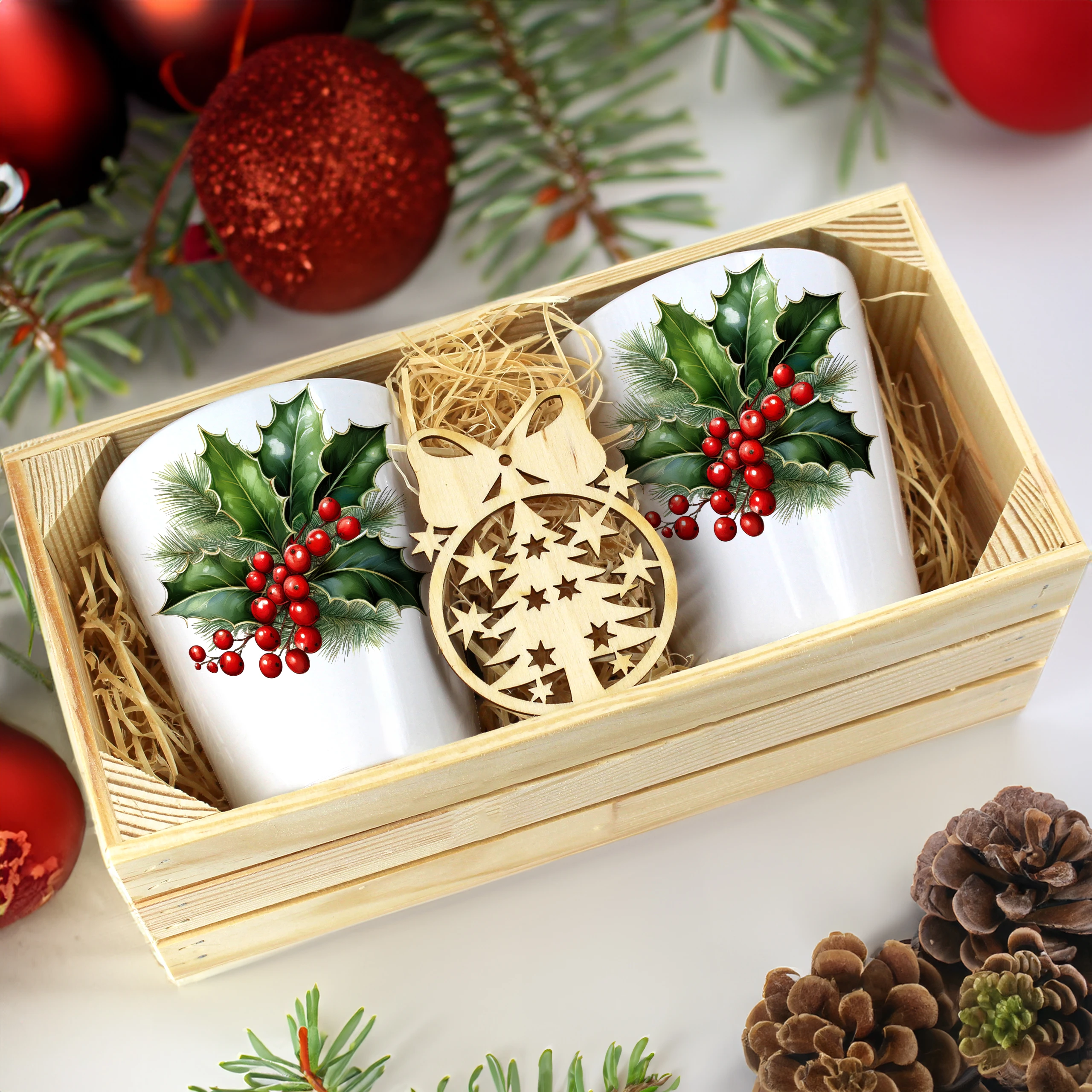 Zestaw składa się z dwóch kubków latte, które są starannie zapakowane w elegancką drewnianą skrzyneczkę. Dodatkowo, do każdego zestawu dołączona jest drewniana bombka, co czyni go idealnym prezentem na święta, urodziny czy inne specjalne okazje. Kubki zostały zaprojektowane, nadrukowane i pakowane w naszej pracowni, co zapewnia ich oryginalność oraz wysoką jakość.