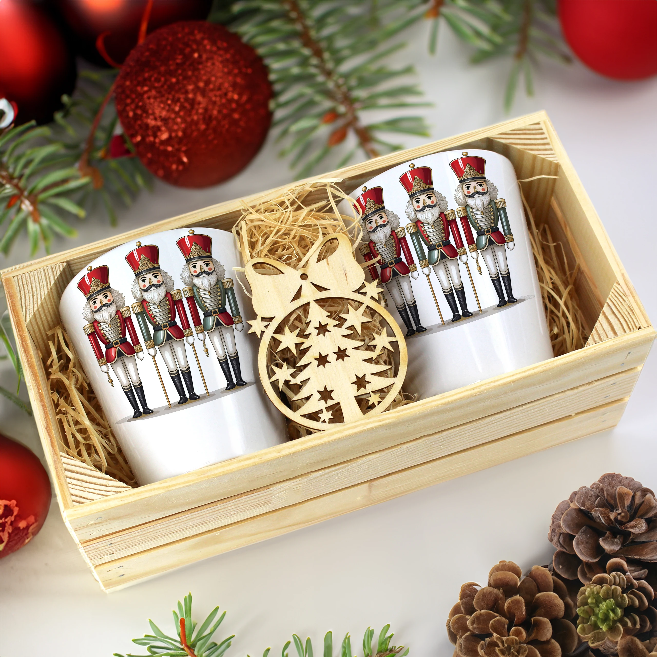 Zestaw składa się z dwóch kubków latte, które są starannie zapakowane w elegancką drewnianą skrzyneczkę. Dodatkowo, do każdego zestawu dołączona jest drewniana bombka, co czyni go idealnym prezentem na święta, urodziny czy inne specjalne okazje. Kubki zostały zaprojektowane, nadrukowane i pakowane w naszej pracowni, co zapewnia ich oryginalność oraz wysoką jakość.