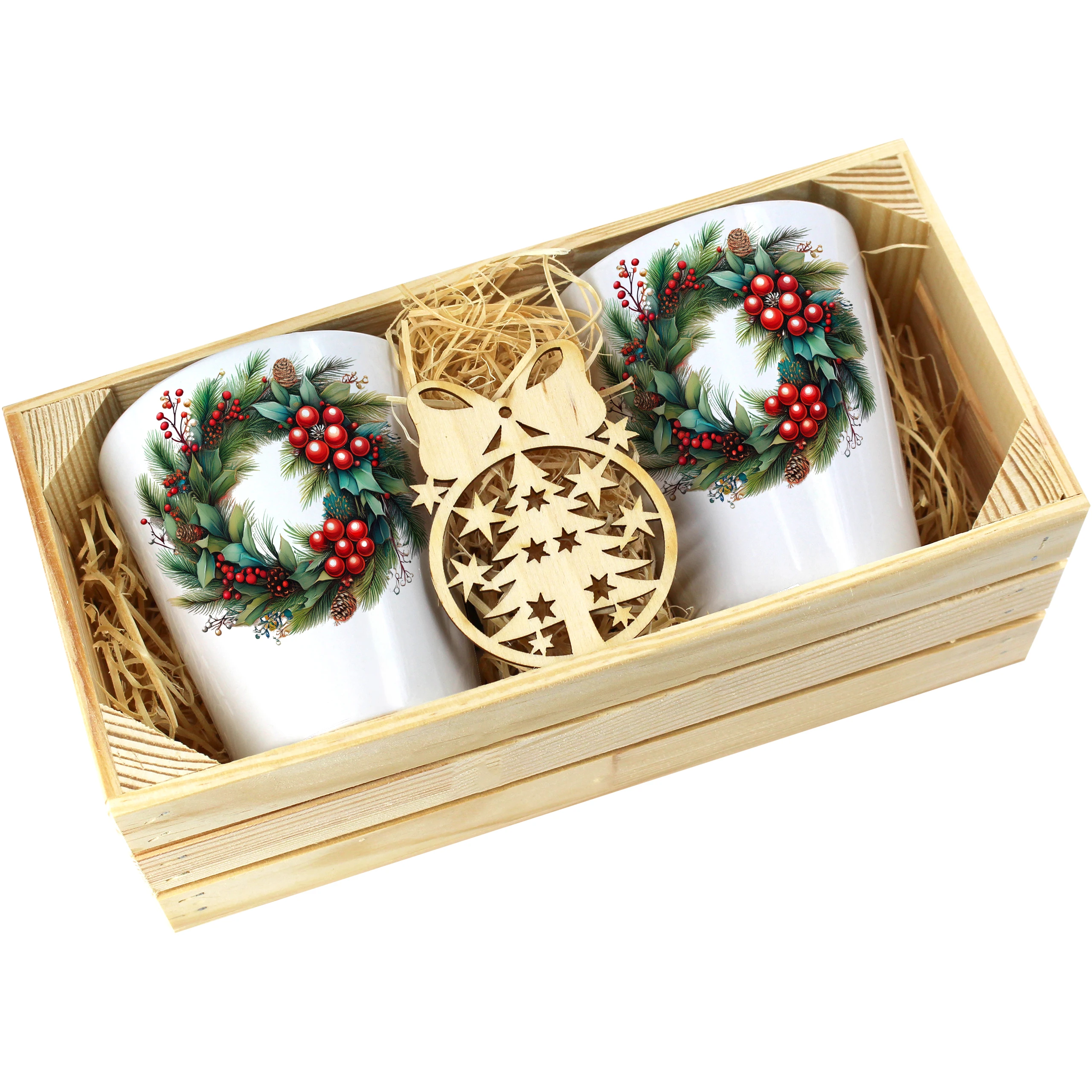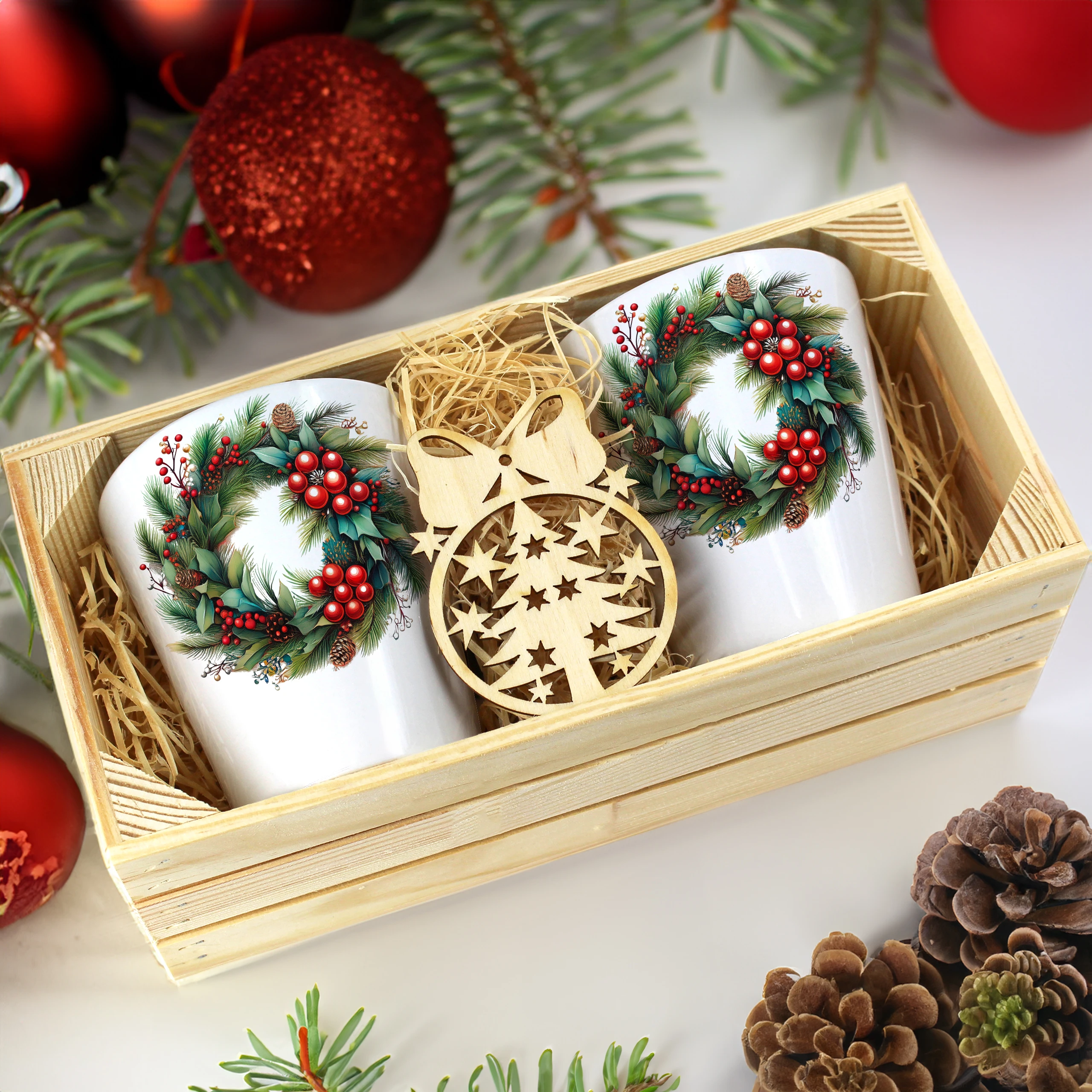 Zestaw składa się z dwóch kubków latte, które są starannie zapakowane w elegancką drewnianą skrzyneczkę. Dodatkowo, do każdego zestawu dołączona jest drewniana bombka, co czyni go idealnym prezentem na święta, urodziny czy inne specjalne okazje. Kubki zostały zaprojektowane, nadrukowane i pakowane w naszej pracowni, co zapewnia ich oryginalność oraz wysoką jakość.