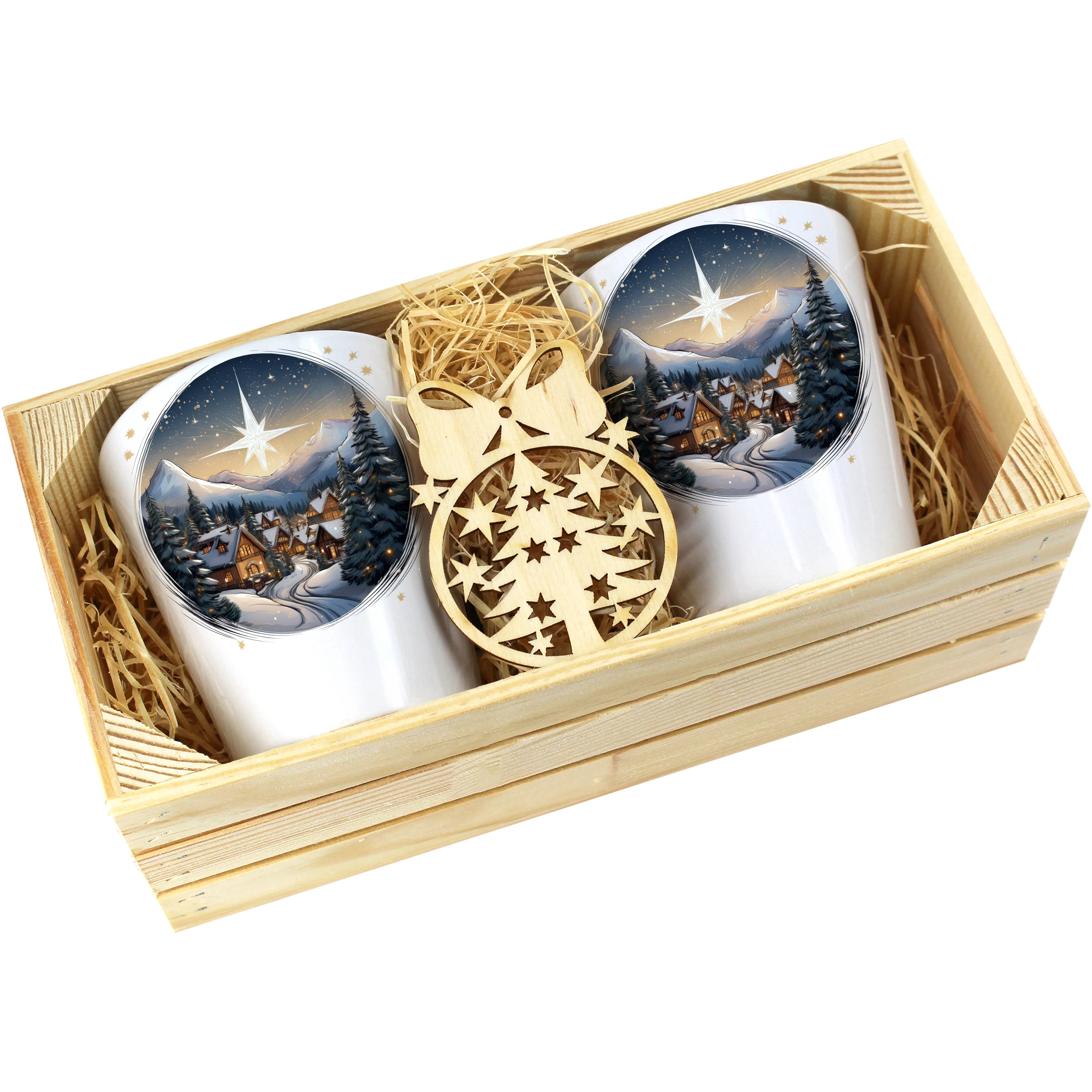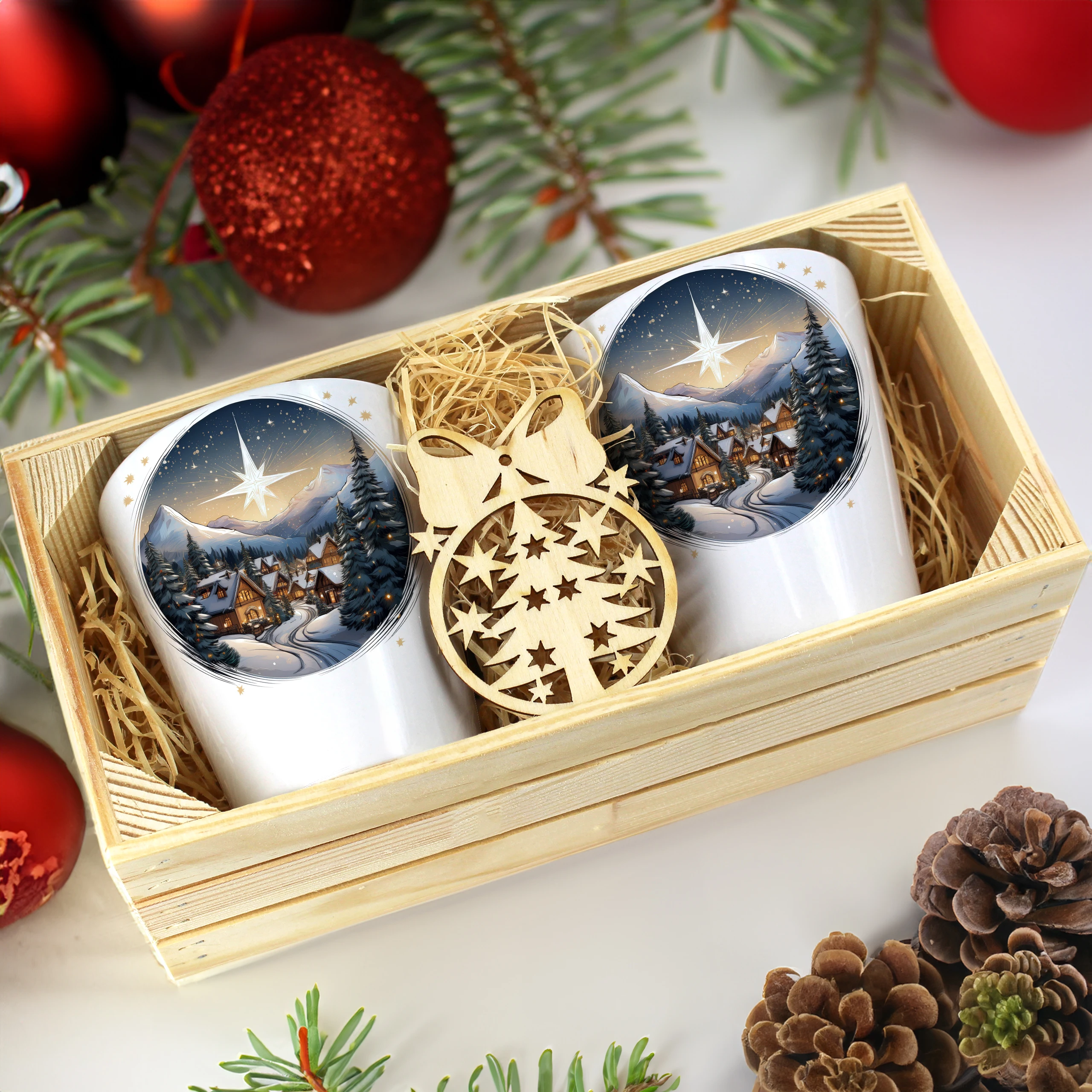 Zestaw składa się z dwóch kubków latte, które są starannie zapakowane w elegancką drewnianą skrzyneczkę. Dodatkowo, do każdego zestawu dołączona jest drewniana bombka, co czyni go idealnym prezentem na święta, urodziny czy inne specjalne okazje. Kubki zostały zaprojektowane, nadrukowane i pakowane w naszej pracowni, co zapewnia ich oryginalność oraz wysoką jakość.