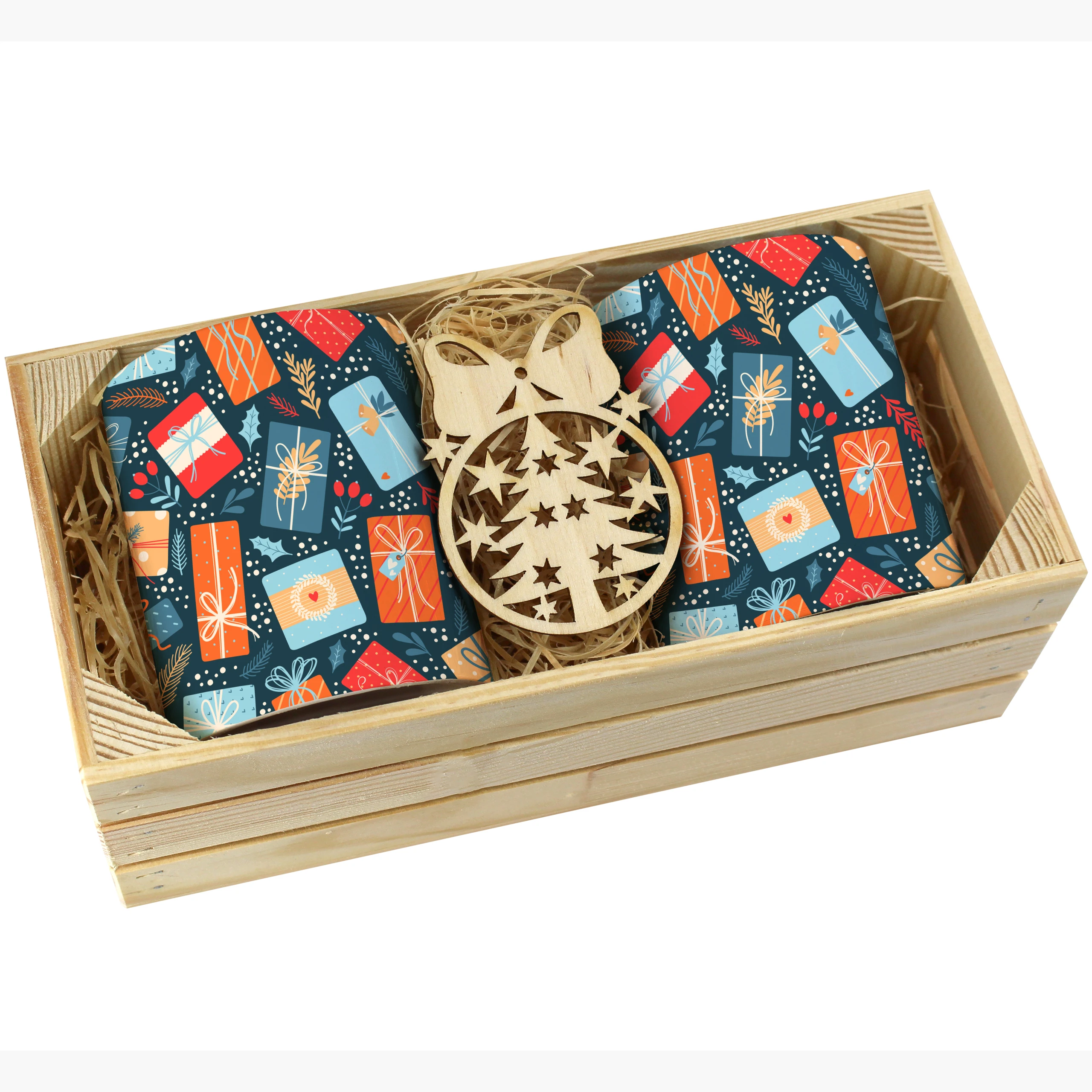 Dodatkowo, do każdego zestawu dołączona jest drewniana bombka, idealnie uzupełniająca świąteczny klimat kompletu. Bombka doskonale sprawdzi się jako ozdoba choinkowa lub dekoracja wnętrza, przywołując magiczny nastrój świąt.