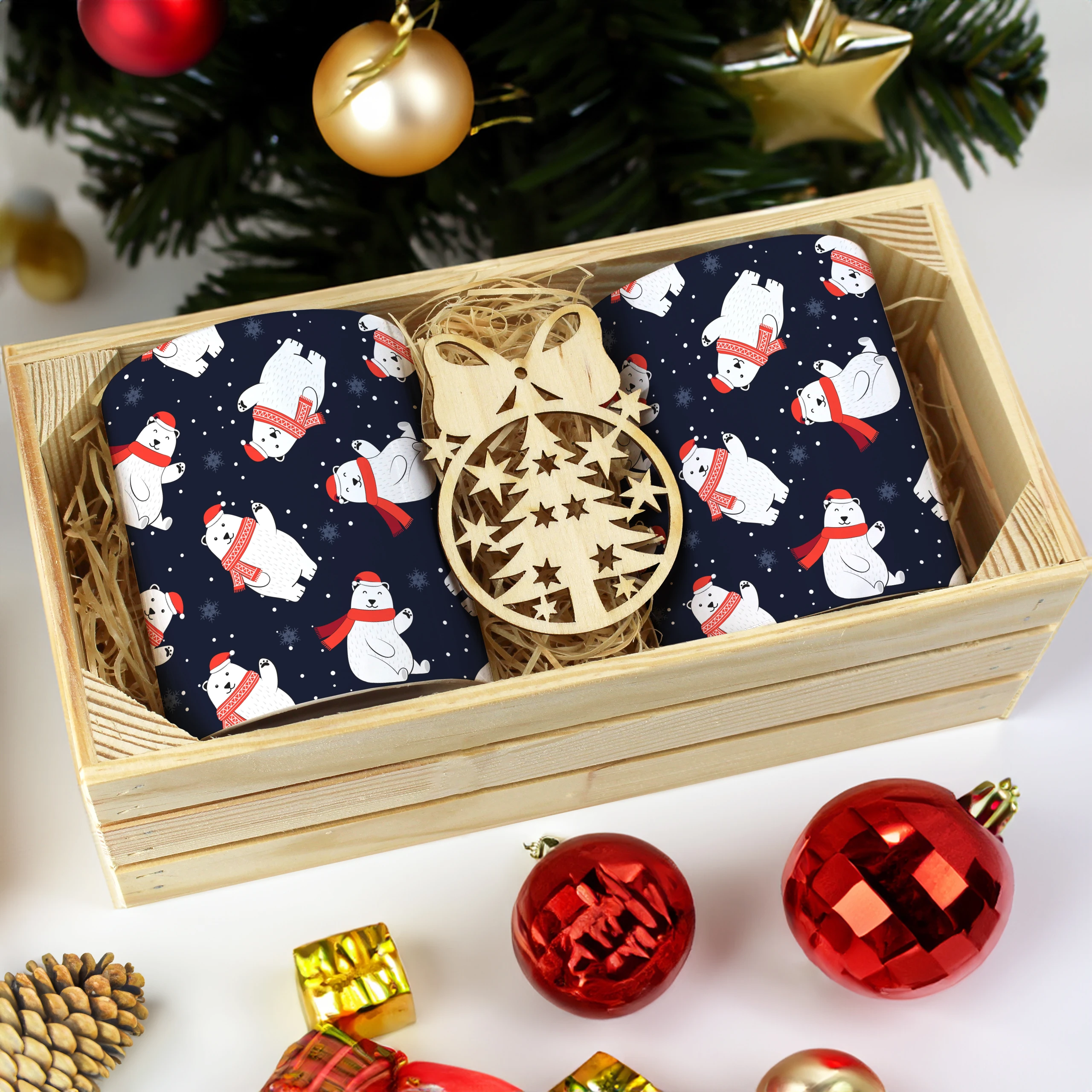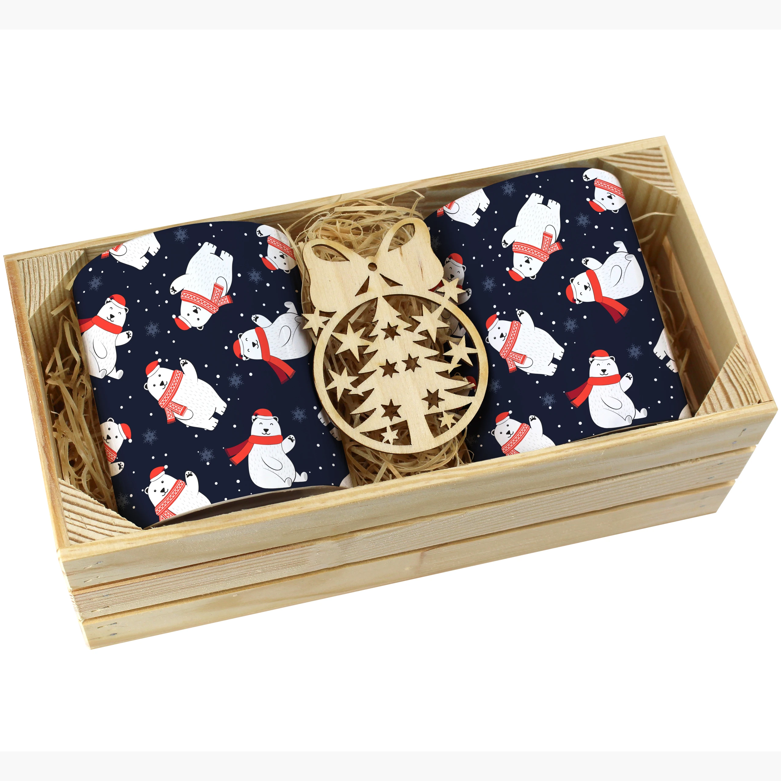 Dodatkowo, do każdego zestawu dołączona jest drewniana bombka, idealnie uzupełniająca świąteczny klimat kompletu. Bombka doskonale sprawdzi się jako ozdoba choinkowa lub dekoracja wnętrza, przywołując magiczny nastrój świąt.