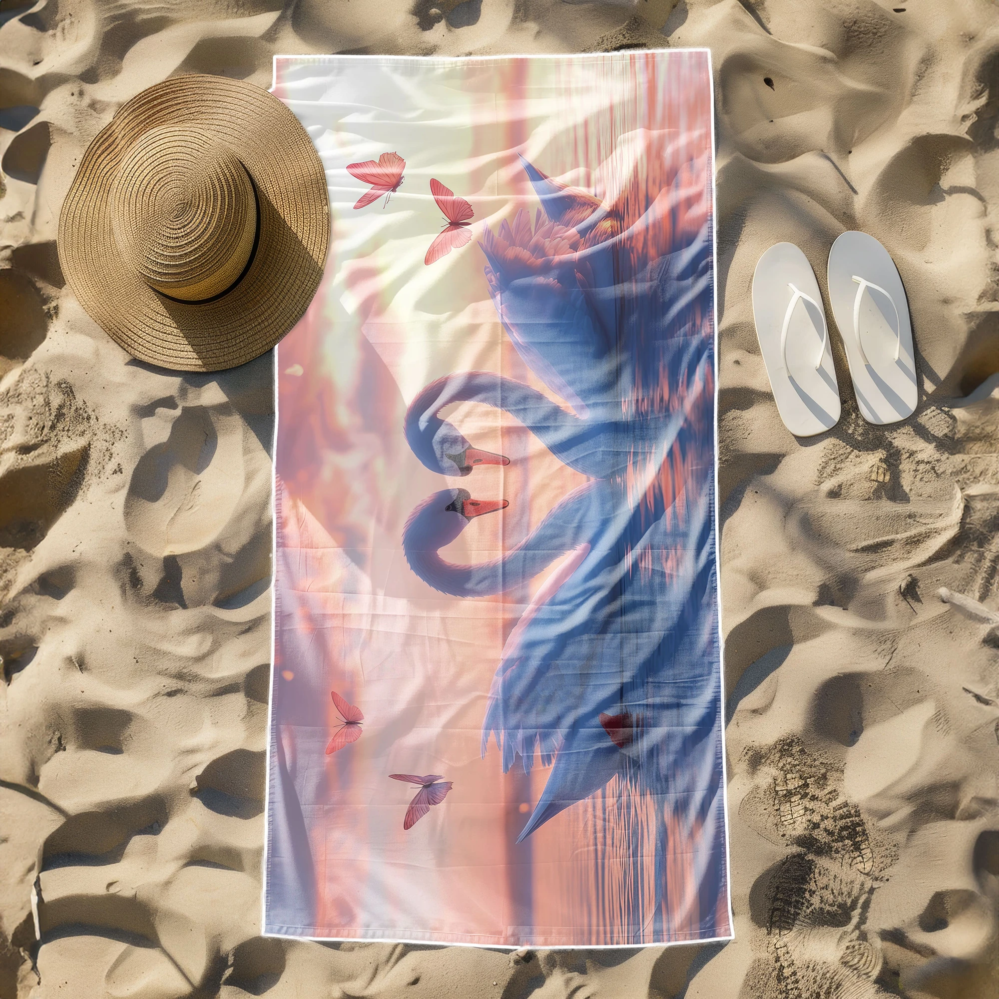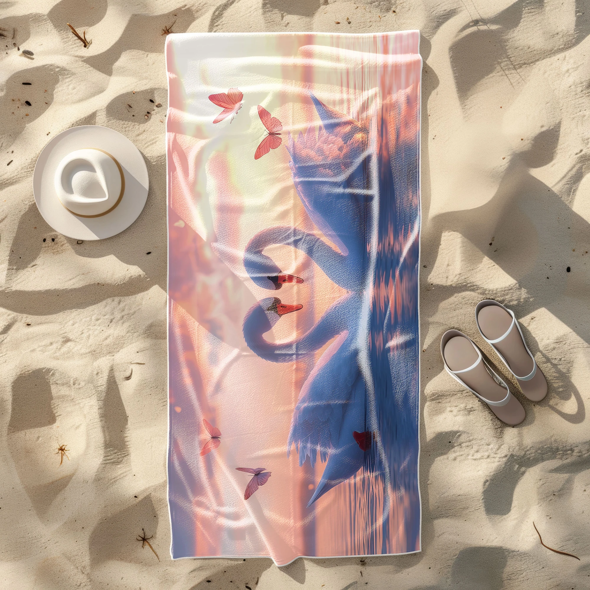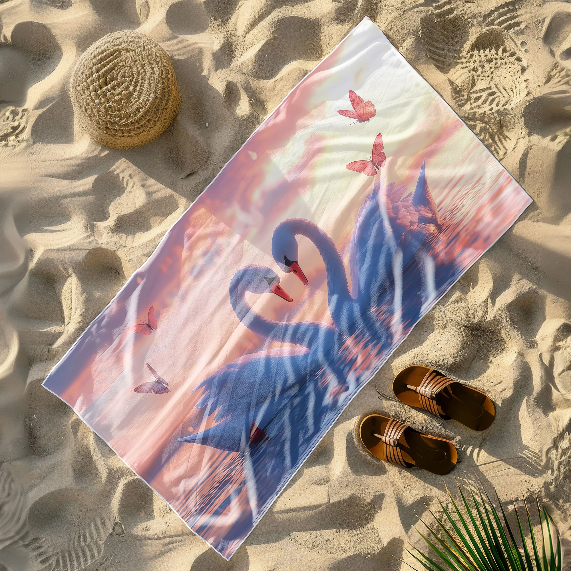 Otul się odrobiną magii i zabierz ze sobą na wakacje prawdziwie baśniowy klimat! 🦢 Ten zjawiskowy, lekki ręcznik plażowy z mikrofibry z kolekcji MARINA, zachwycający romantycznym motywem dwóch białych łabędzi tworzących kształt serca na tle pastelowego zachodu słońca, to definicja subtelnej elegancji. Różowe motyle i spokojna tafla wody dodają mu niesamowitego uroku. Został stworzony dla marzycieli, romantyków i osób ceniących sobie nastrojowe, pełne ciepła wzornictwo na plaży. ✨