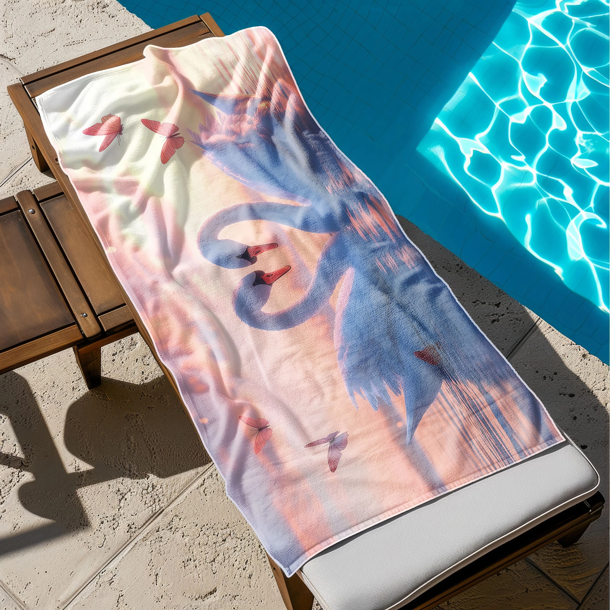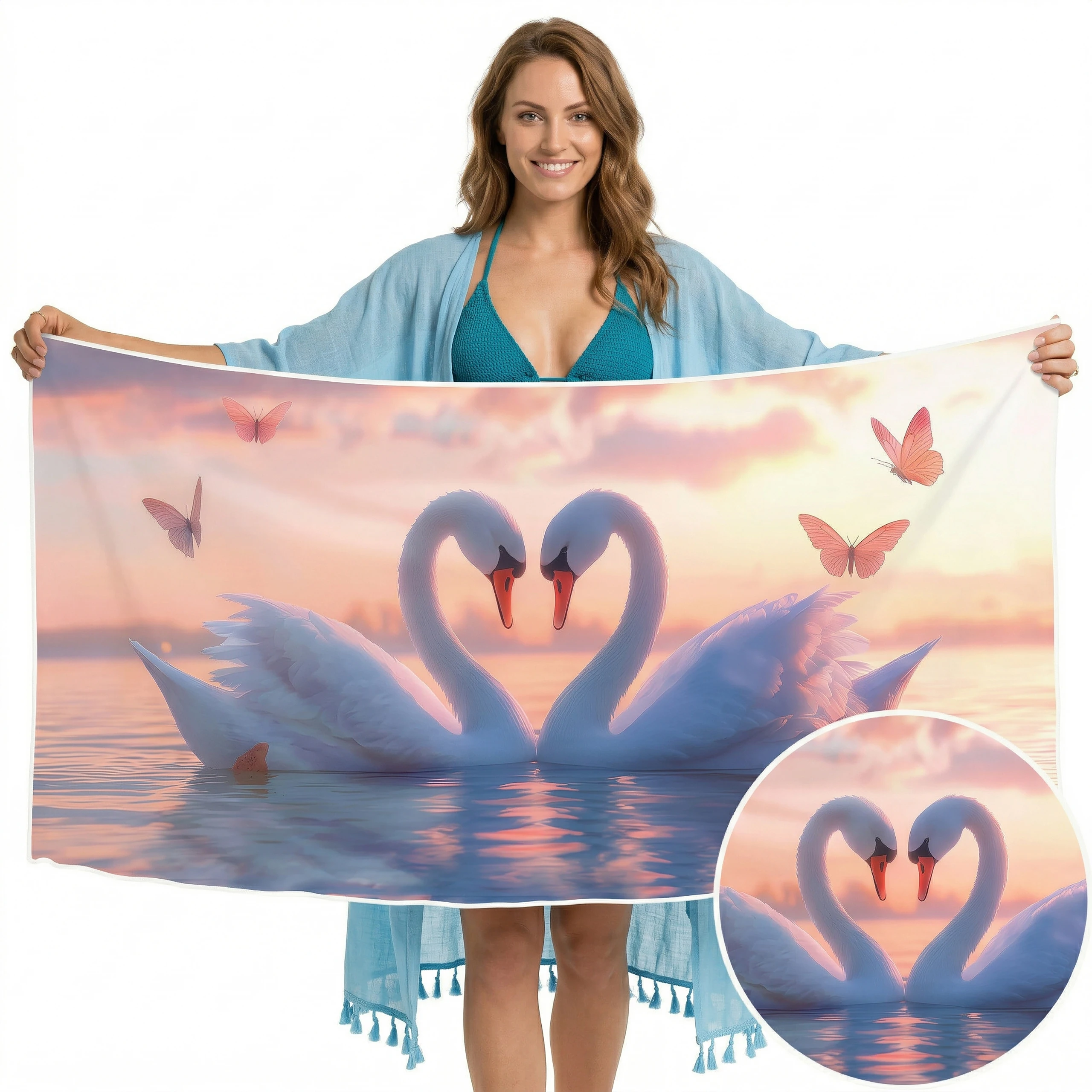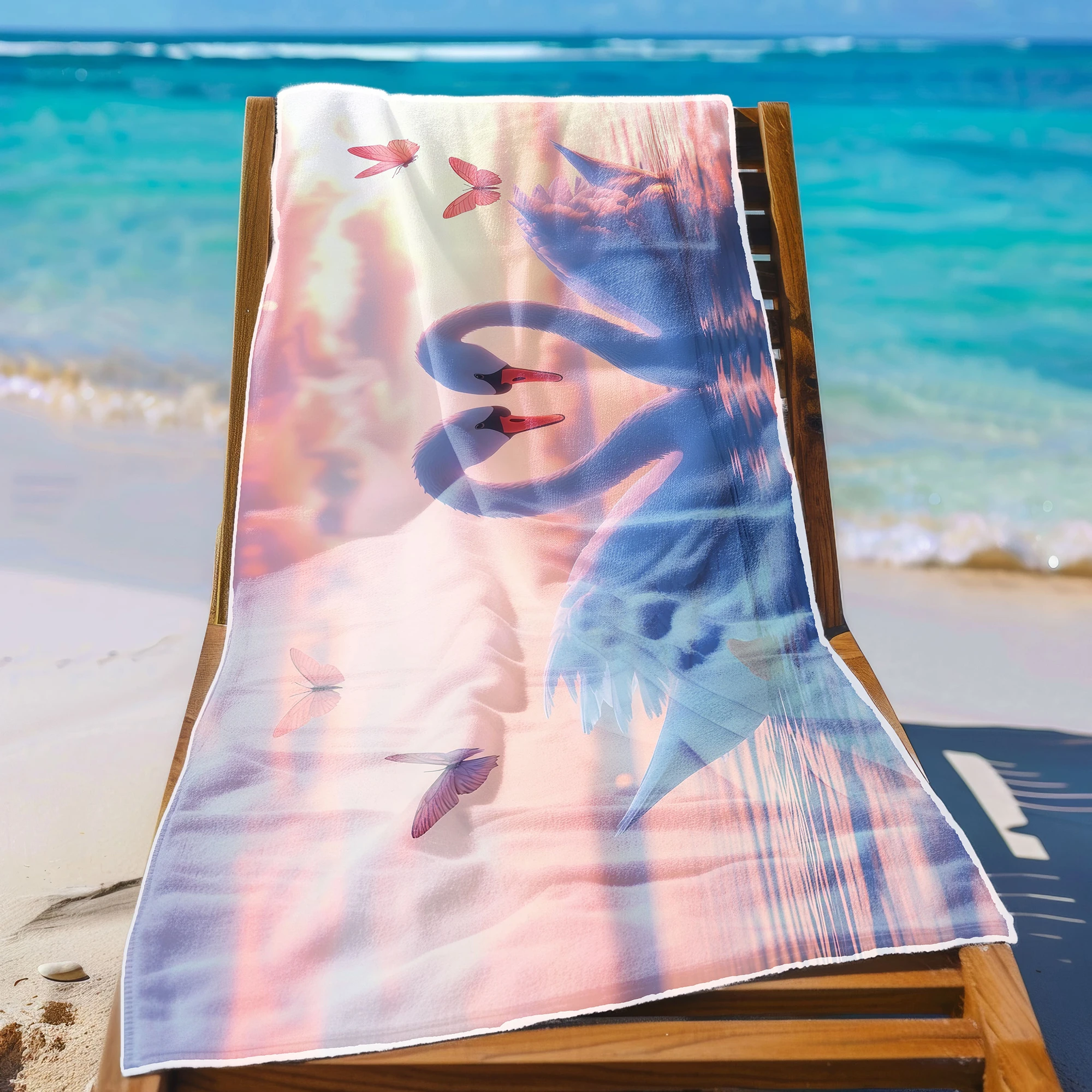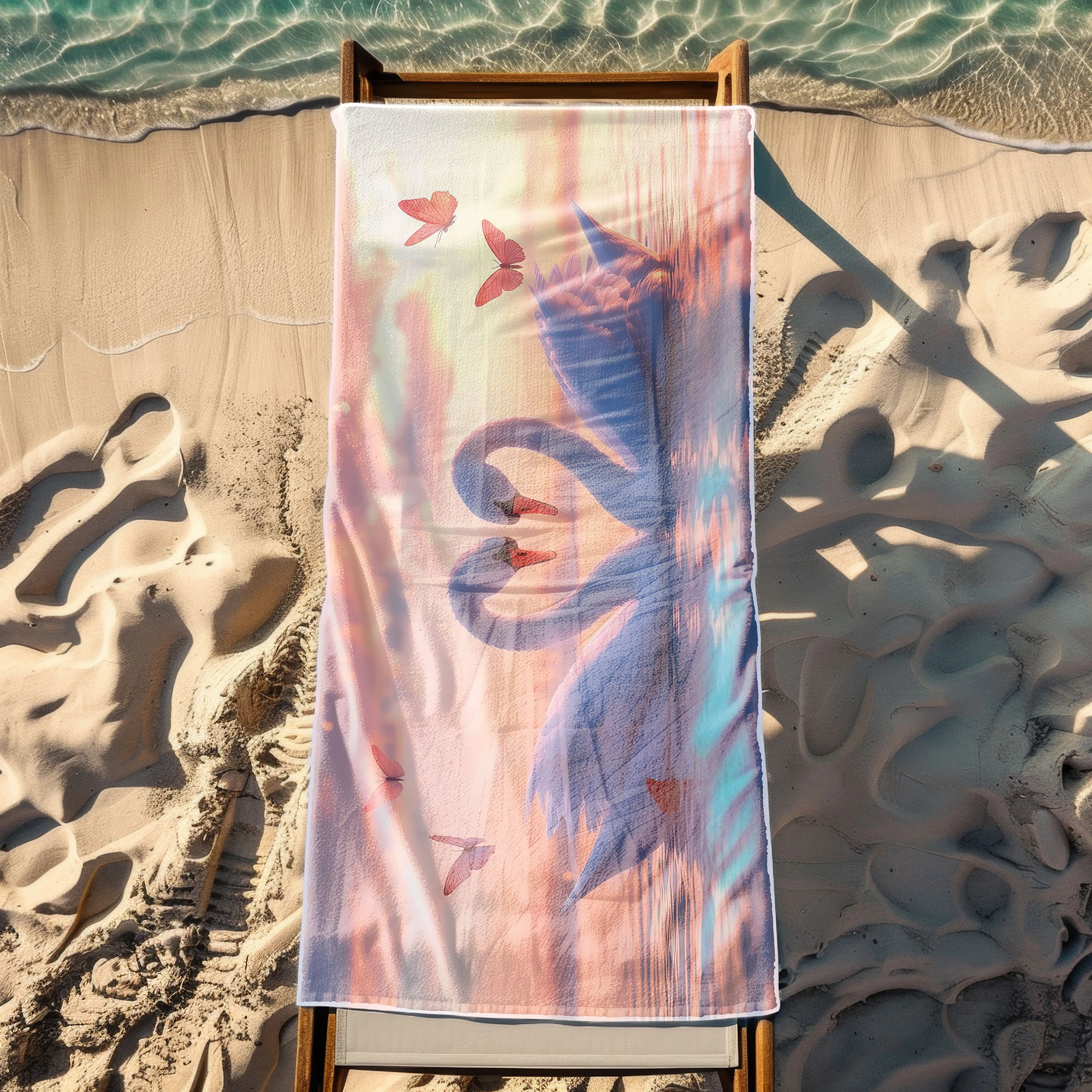 Otul się odrobiną magii i zabierz ze sobą na wakacje prawdziwie baśniowy klimat! 🦢 Ten zjawiskowy, lekki ręcznik plażowy z mikrofibry z kolekcji MARINA, zachwycający romantycznym motywem dwóch białych łabędzi tworzących kształt serca na tle pastelowego zachodu słońca, to definicja subtelnej elegancji. Różowe motyle i spokojna tafla wody dodają mu niesamowitego uroku. Został stworzony dla marzycieli, romantyków i osób ceniących sobie nastrojowe, pełne ciepła wzornictwo na plaży. ✨