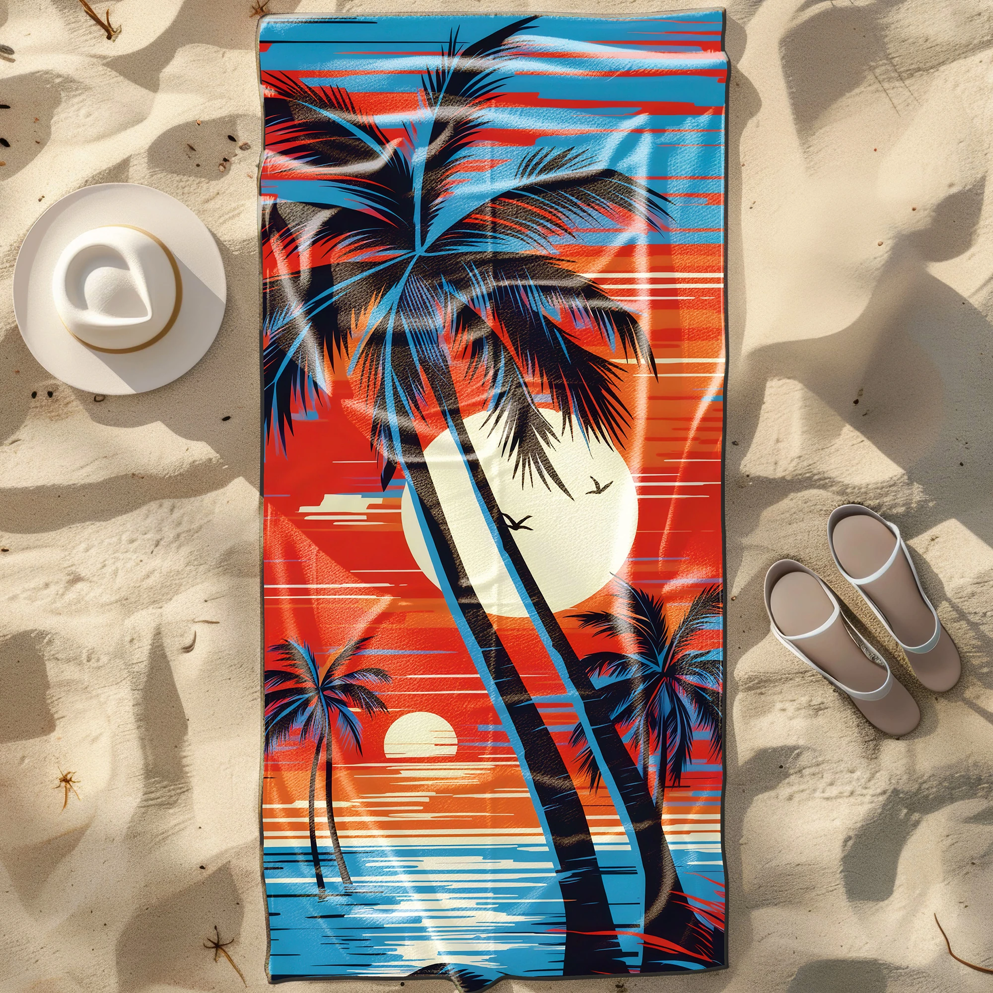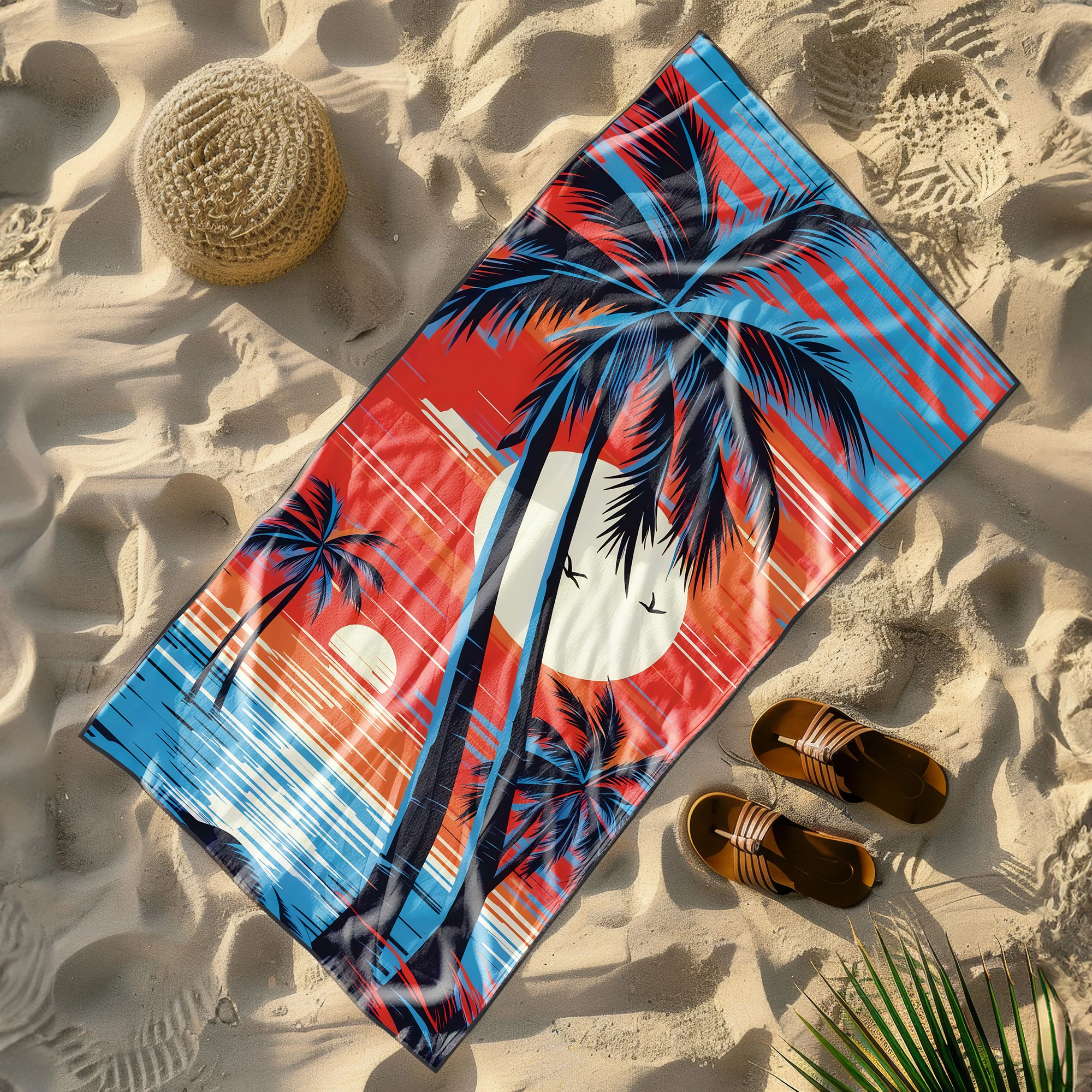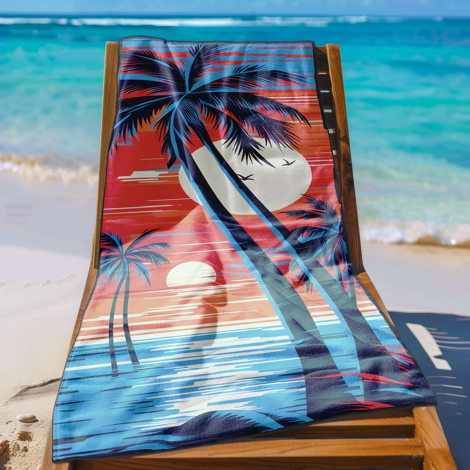 Poczuj klimat gorących, wakacyjnych wieczorów i wyróżnij się na plaży unikalnym stylem! 🌴 Ten niezwykły, lekki ręcznik plażowy z mikrofibry z kolekcji MARINA przyciąga spojrzenia zjawiskowym, egzotycznym motywem. Kontrastowe, czarne sylwetki palm na tle ogromnego słońca i poziomych, jaskrawych pasów w odcieniach głębokiego błękitu, czerwieni i pomarańczu tworzą niesamowity efekt retro. To absolutny hit dla osób, które cenią odważny design i pragną przenieść się myślami na rajską plażę z lat 80. ✨