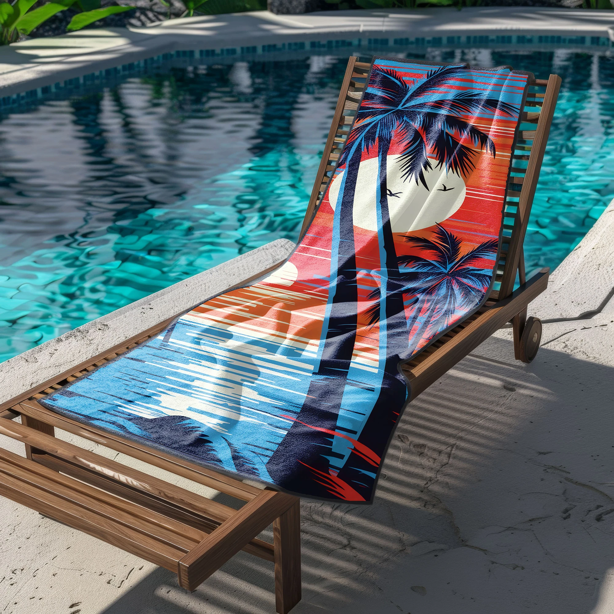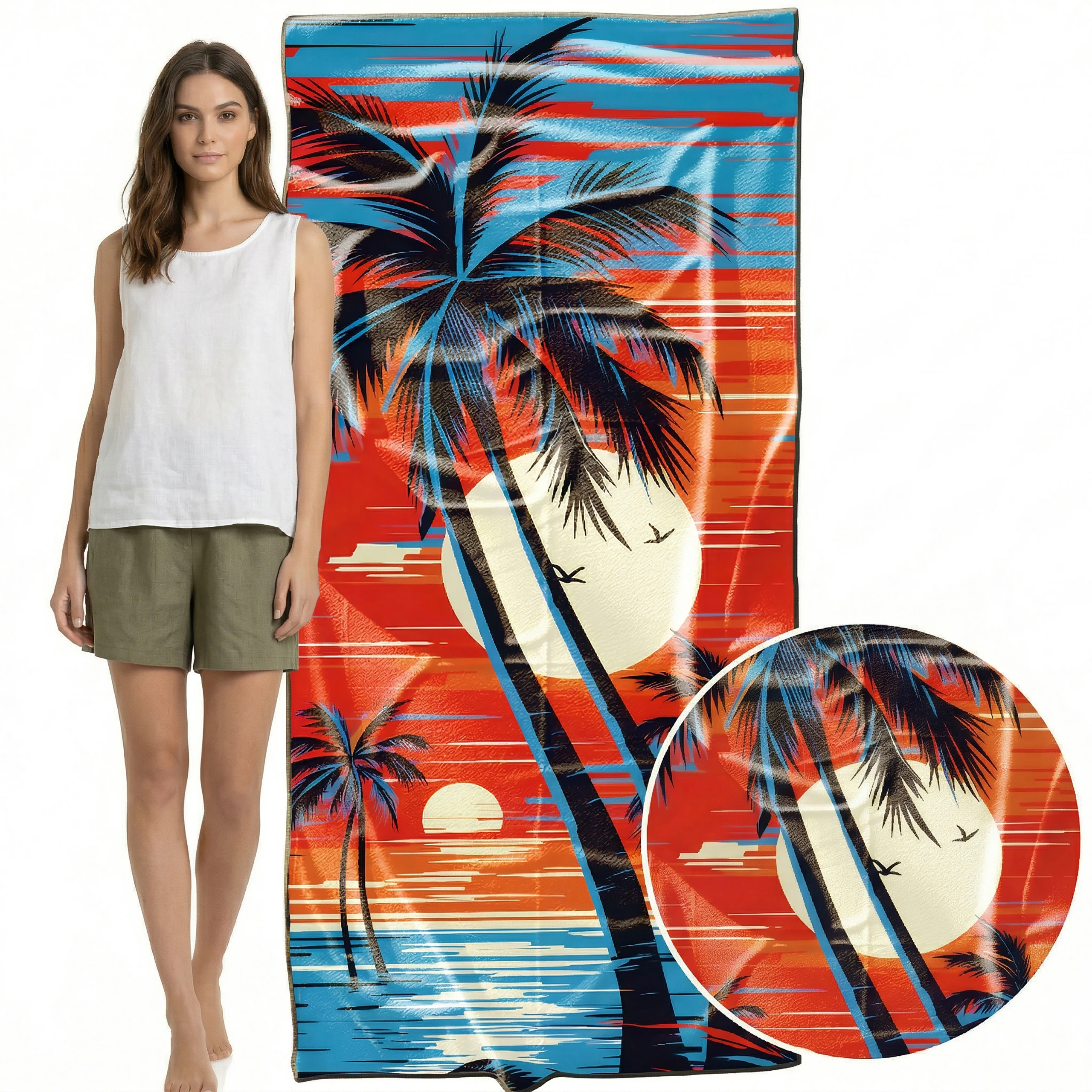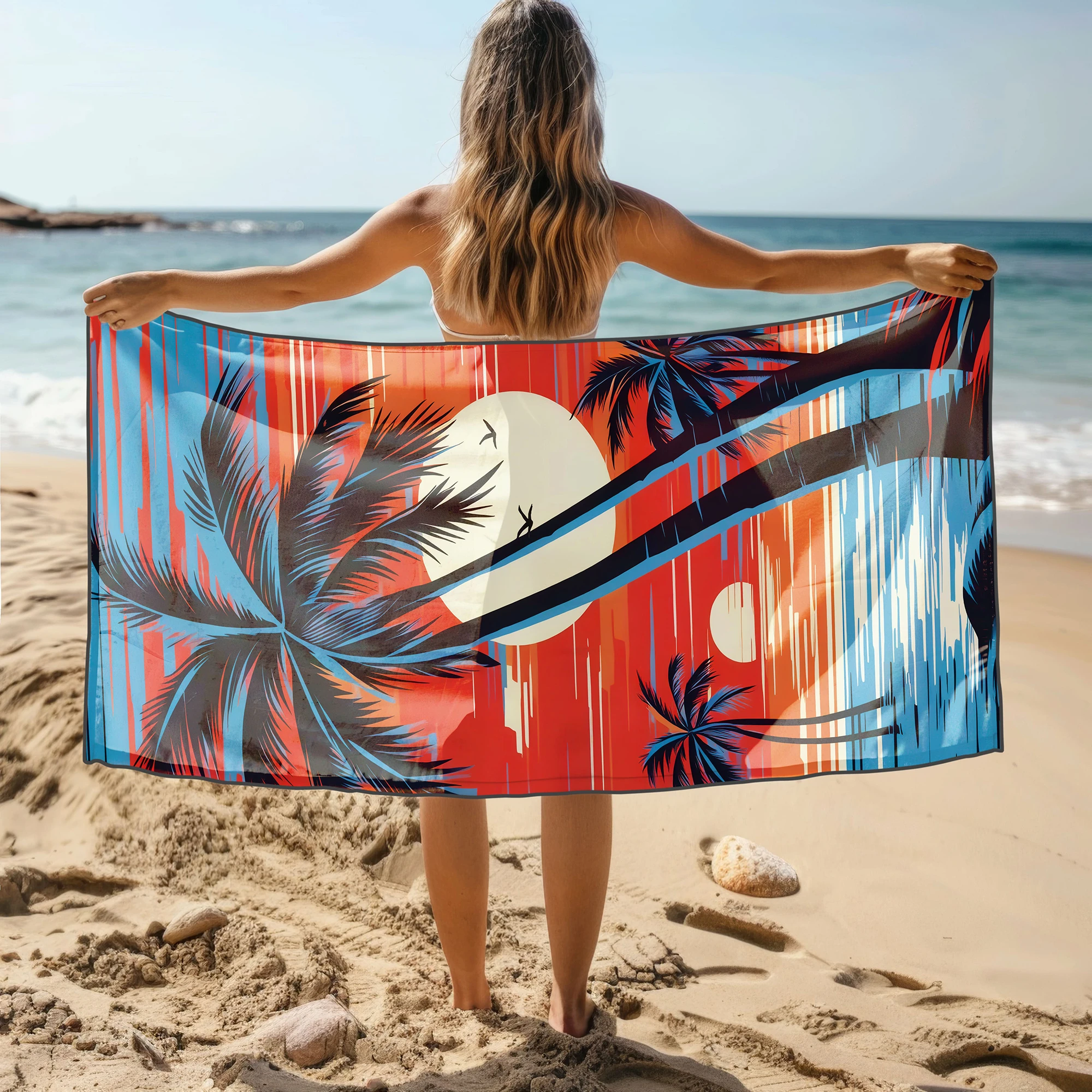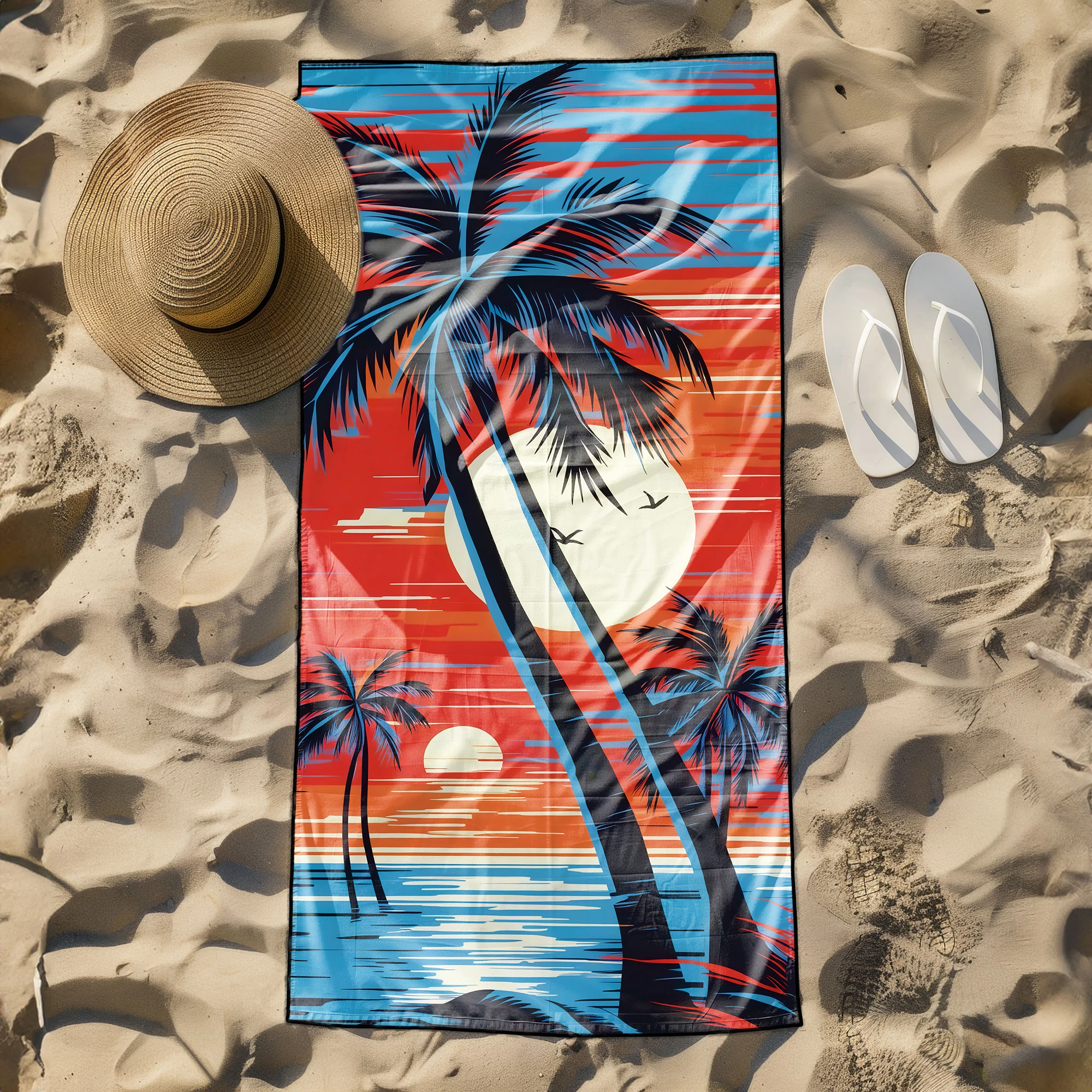 Poczuj klimat gorących, wakacyjnych wieczorów i wyróżnij się na plaży unikalnym stylem! 🌴 Ten niezwykły, lekki ręcznik plażowy z mikrofibry z kolekcji MARINA przyciąga spojrzenia zjawiskowym, egzotycznym motywem. Kontrastowe, czarne sylwetki palm na tle ogromnego słońca i poziomych, jaskrawych pasów w odcieniach głębokiego błękitu, czerwieni i pomarańczu tworzą niesamowity efekt retro. To absolutny hit dla osób, które cenią odważny design i pragną przenieść się myślami na rajską plażę z lat 80. ✨
