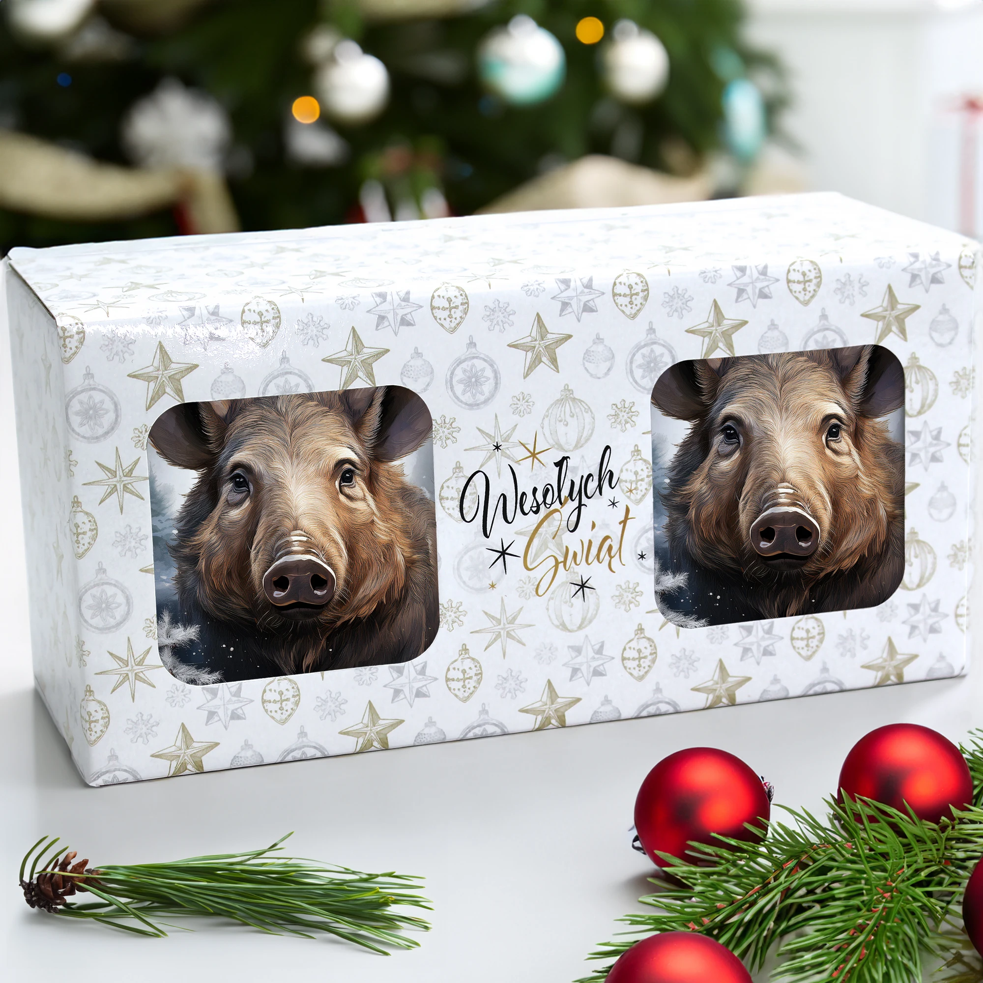 Komplet dwóch kubków 330 ml z wyjątkowym świątecznym motywem to elegancka propozycja na prezent, zapakowana w ozdobne pudełko o wymiarach 22,5x11x9,5 cm z okienkiem, które umożliwia zaprezentowanie wzoru kubków. Kubki o pojemności 330 ml, ozdobione pięknym świątecznym nadrukiem, są praktyczne i funkcjonalne, ponieważ można je myć w zmywarce. Dzięki temu zestaw stanowi doskonały wybór na prezent, który łączy estetykę z wygodą codziennego użytkowania. Projekt i cały proces produkcji odbywa się w naszej pracowni, co zapewnia ich unikalność i wysoką jakość wykonania.