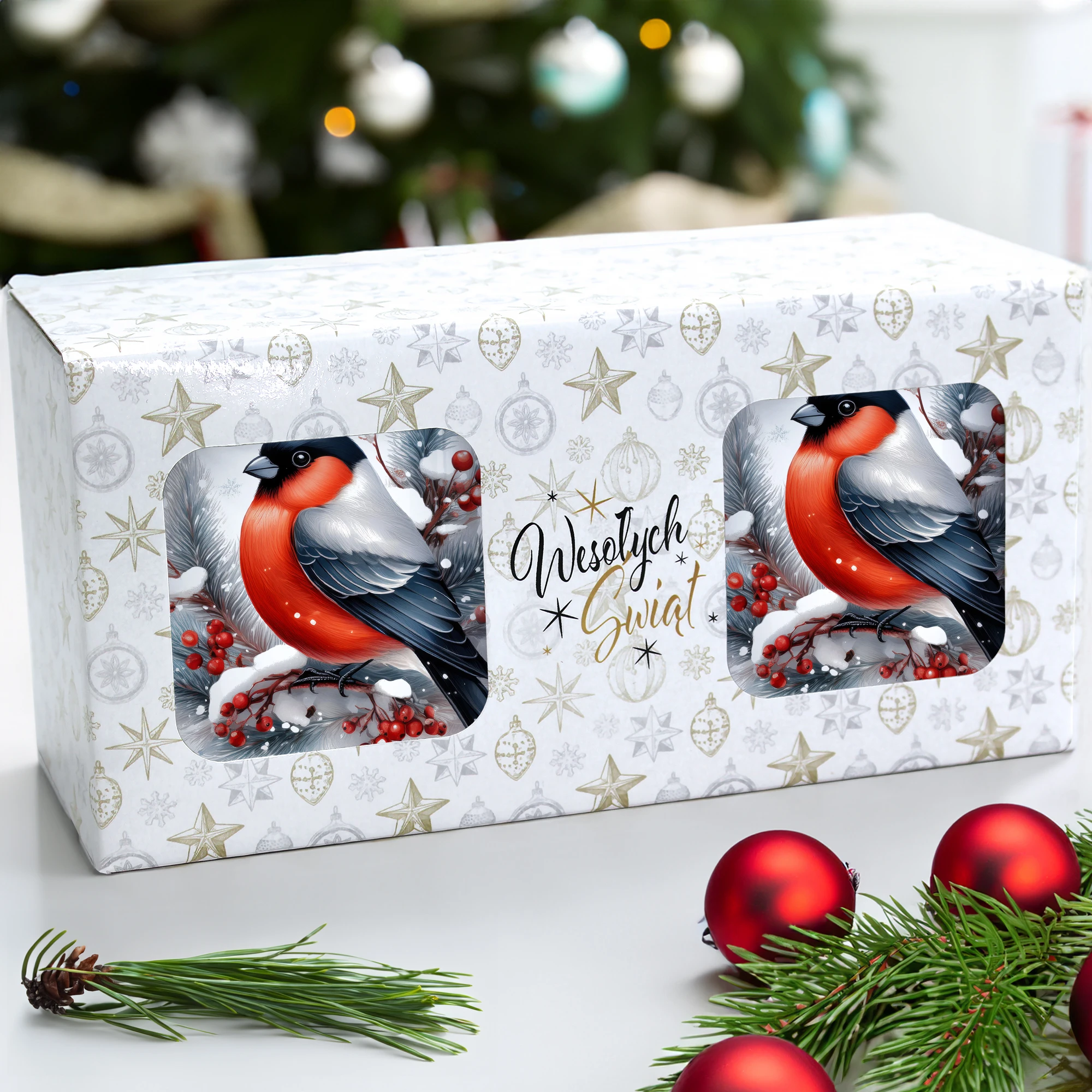 Komplet dwóch kubków 330 ml z wyjątkowym świątecznym motywem to elegancka propozycja na prezent, zapakowana w ozdobne pudełko o wymiarach 22,5x11x9,5 cm z okienkiem, które umożliwia zaprezentowanie wzoru kubków. Kubki o pojemności 330 ml, ozdobione pięknym świątecznym nadrukiem, są praktyczne i funkcjonalne, ponieważ można je myć w zmywarce. Dzięki temu zestaw stanowi doskonały wybór na prezent, który łączy estetykę z wygodą codziennego użytkowania. Projekt i cały proces produkcji odbywa się w naszej pracowni, co zapewnia ich unikalność i wysoką jakość wykonania.