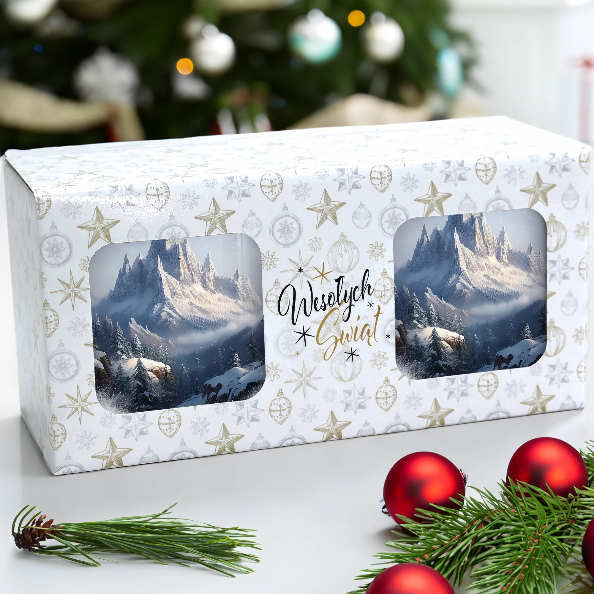 Komplet dwóch kubków 330 ml z wyjątkowym świątecznym motywem to elegancka propozycja na prezent, zapakowana w ozdobne pudełko o wymiarach 22,5x11x9,5 cm z okienkiem, które umożliwia zaprezentowanie wzoru kubków. Kubki o pojemności 330 ml, ozdobione pięknym świątecznym nadrukiem, są praktyczne i funkcjonalne, ponieważ można je myć w zmywarce. Dzięki temu zestaw stanowi doskonały wybór na prezent, który łączy estetykę z wygodą codziennego użytkowania. Projekt i cały proces produkcji odbywa się w naszej pracowni, co zapewnia ich unikalność i wysoką jakość wykonania.