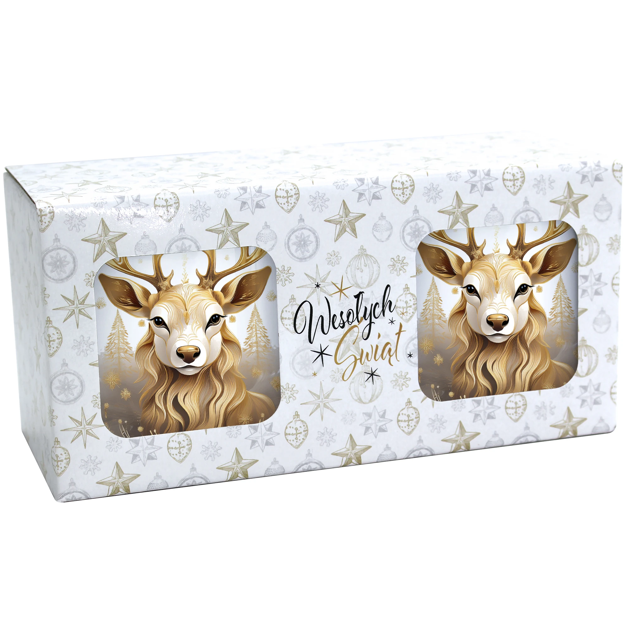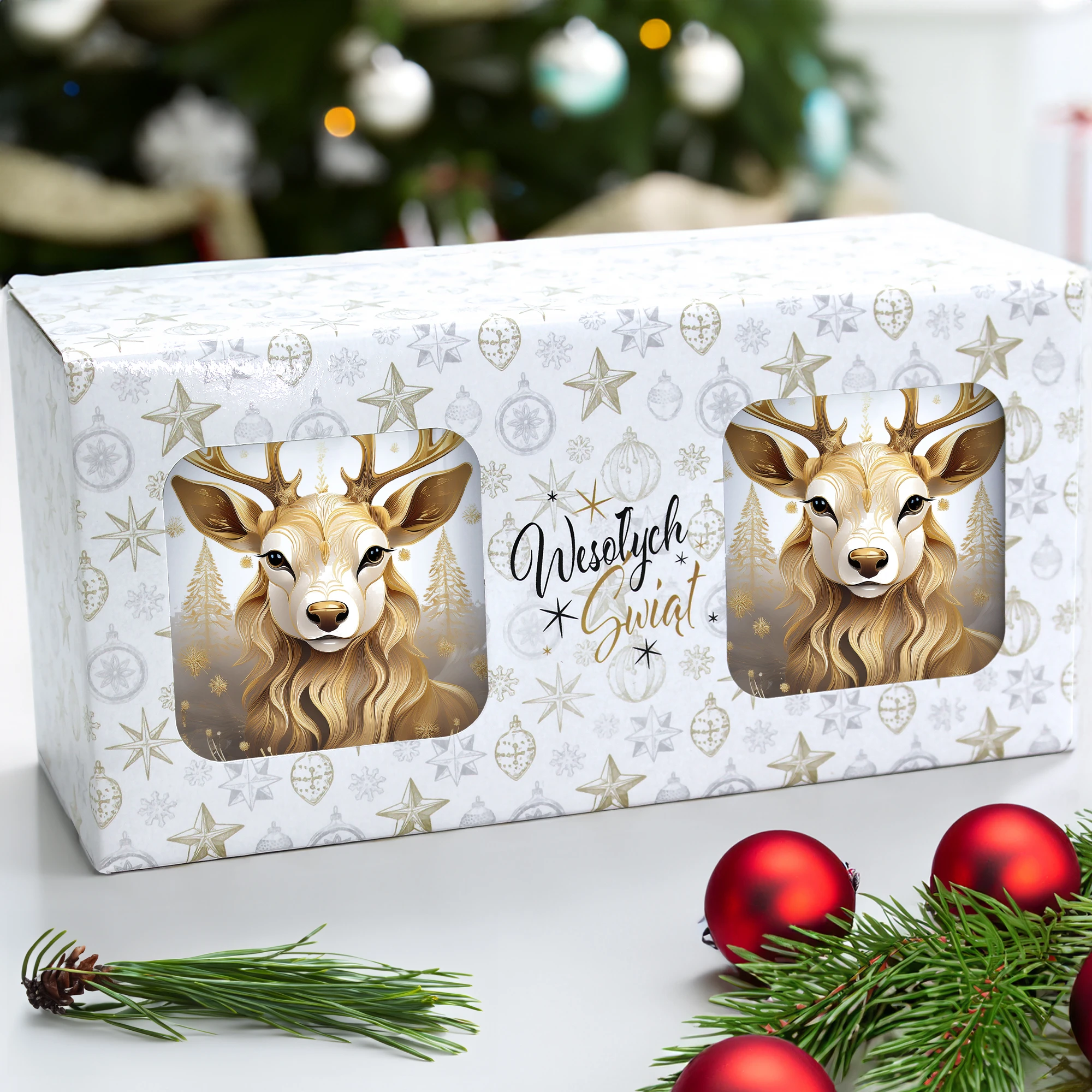 Komplet dwóch kubków 330 ml z wyjątkowym świątecznym motywem to elegancka propozycja na prezent, zapakowana w ozdobne pudełko o wymiarach 22,5x11x9,5 cm z okienkiem, które umożliwia zaprezentowanie wzoru kubków. Kubki o pojemności 330 ml, ozdobione pięknym świątecznym nadrukiem, są praktyczne i funkcjonalne, ponieważ można je myć w zmywarce. Dzięki temu zestaw stanowi doskonały wybór na prezent, który łączy estetykę z wygodą codziennego użytkowania. Projekt i cały proces produkcji odbywa się w naszej pracowni, co zapewnia ich unikalność i wysoką jakość wykonania.
