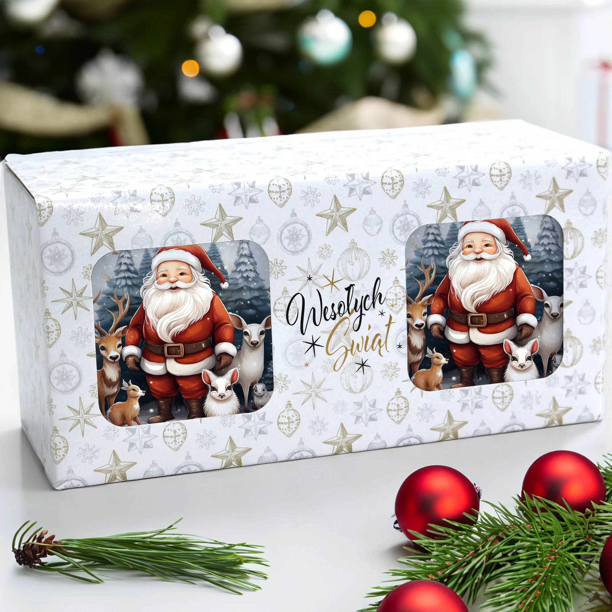 Komplet dwóch kubków 330 ml z wyjątkowym świątecznym motywem to elegancka propozycja na prezent, zapakowana w ozdobne pudełko o wymiarach 22,5x11x9,5 cm z okienkiem, które umożliwia zaprezentowanie wzoru kubków. Kubki o pojemności 330 ml, ozdobione pięknym świątecznym nadrukiem, są praktyczne i funkcjonalne, ponieważ można je myć w zmywarce. Dzięki temu zestaw stanowi doskonały wybór na prezent, który łączy estetykę z wygodą codziennego użytkowania. Projekt i cały proces produkcji odbywa się w naszej pracowni, co zapewnia ich unikalność i wysoką jakość wykonania.