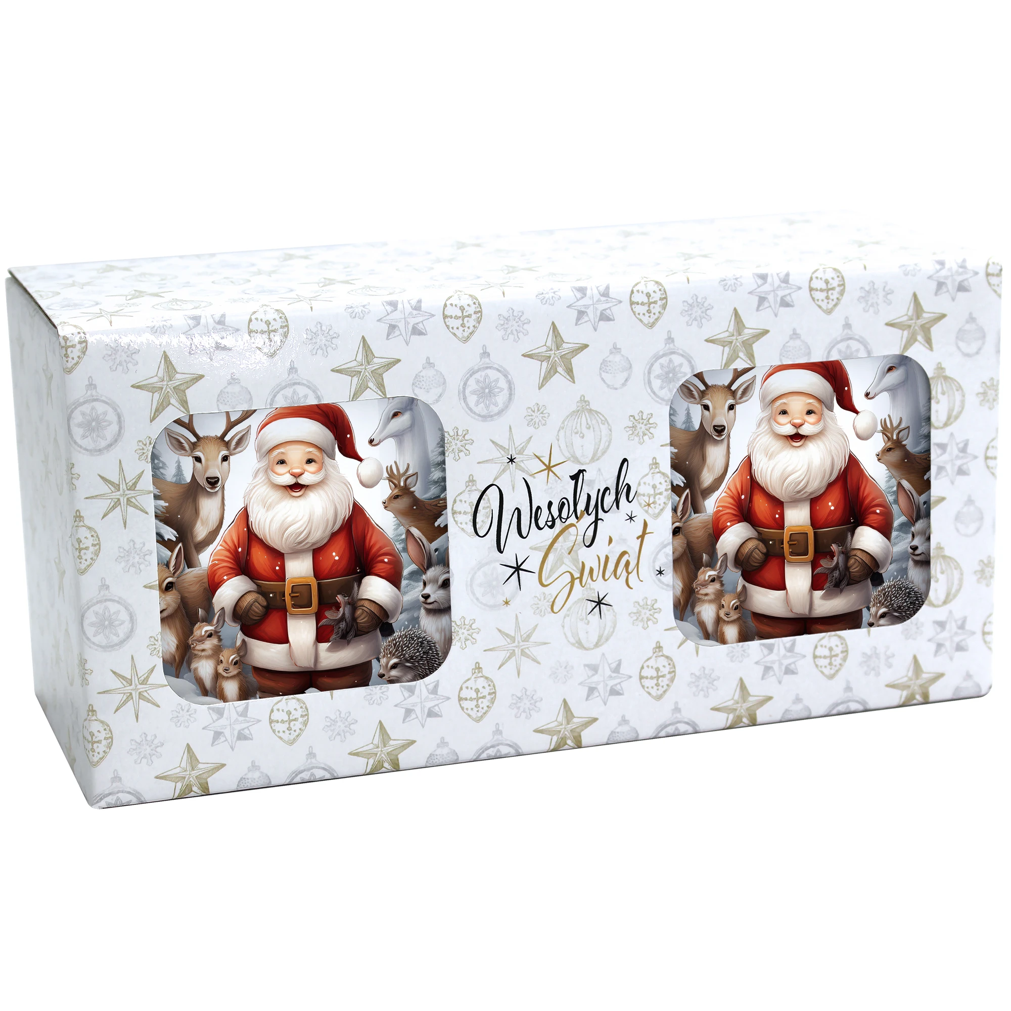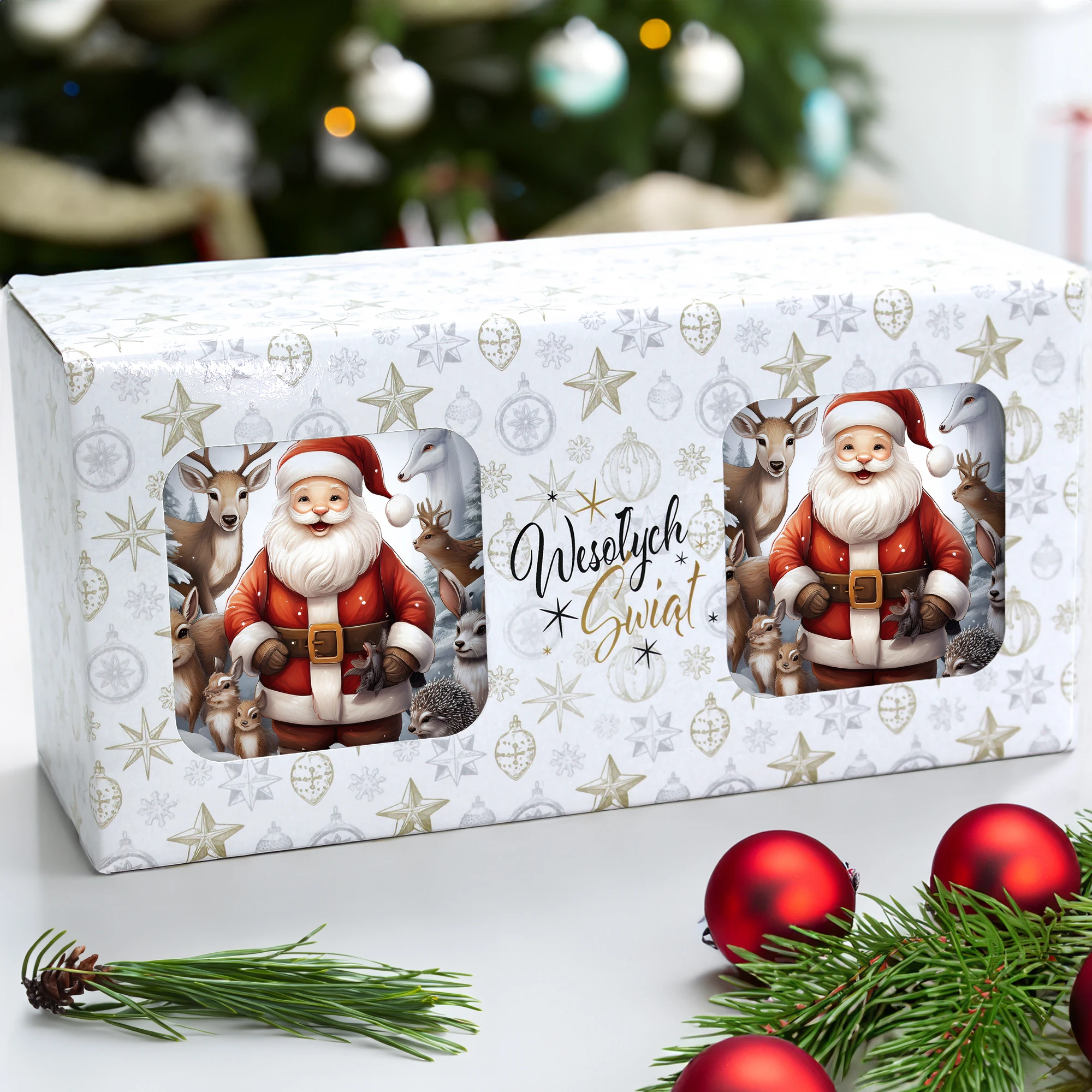 Komplet dwóch kubków 330 ml z wyjątkowym świątecznym motywem to elegancka propozycja na prezent, zapakowana w ozdobne pudełko o wymiarach 22,5x11x9,5 cm z okienkiem, które umożliwia zaprezentowanie wzoru kubków. Kubki o pojemności 330 ml, ozdobione pięknym świątecznym nadrukiem, są praktyczne i funkcjonalne, ponieważ można je myć w zmywarce. Dzięki temu zestaw stanowi doskonały wybór na prezent, który łączy estetykę z wygodą codziennego użytkowania. Projekt i cały proces produkcji odbywa się w naszej pracowni, co zapewnia ich unikalność i wysoką jakość wykonania.