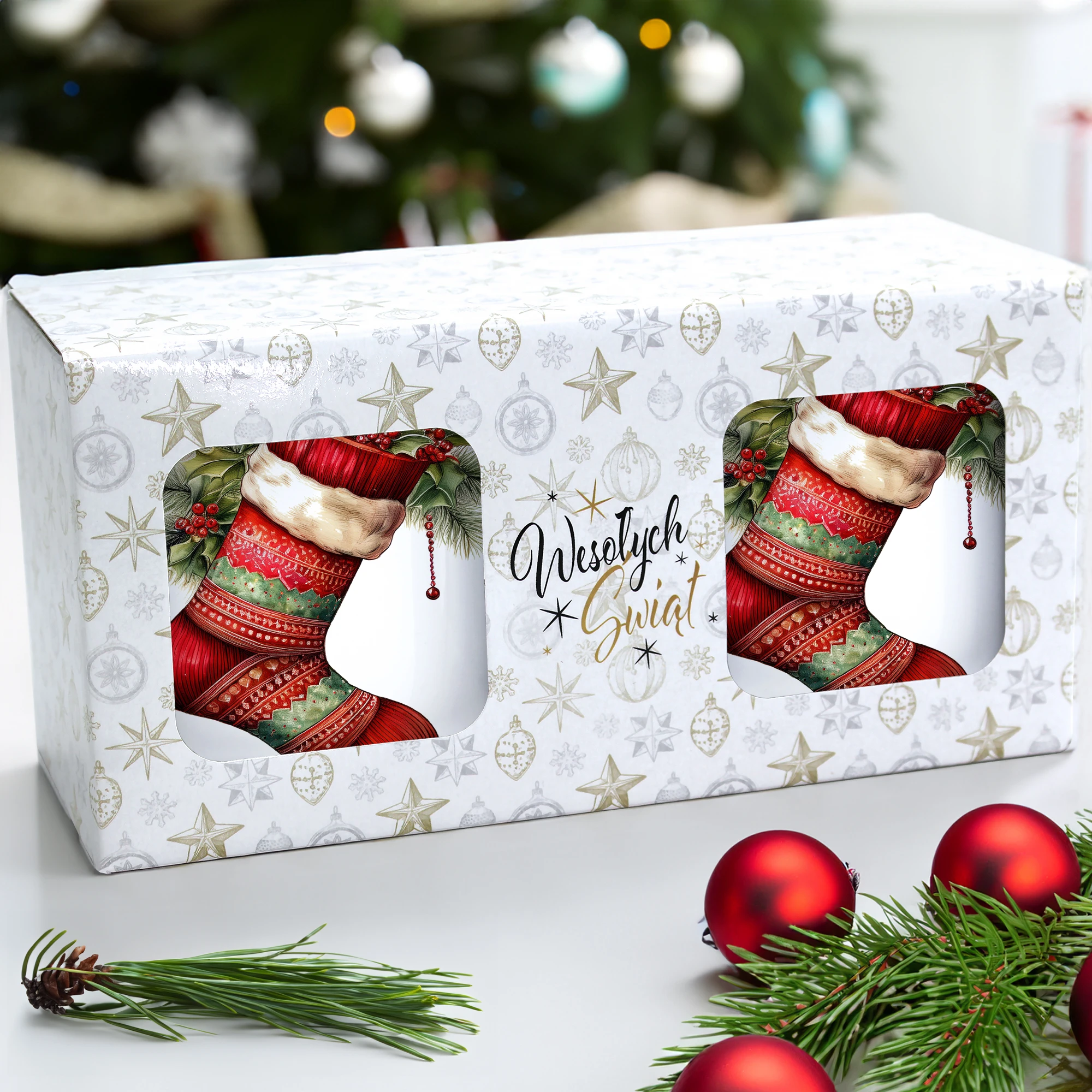 Komplet dwóch kubków 330 ml z wyjątkowym świątecznym motywem to elegancka propozycja na prezent, zapakowana w ozdobne pudełko o wymiarach 22,5x11x9,5 cm z okienkiem, które umożliwia zaprezentowanie wzoru kubków. Kubki o pojemności 330 ml, ozdobione pięknym świątecznym nadrukiem, są praktyczne i funkcjonalne, ponieważ można je myć w zmywarce. Dzięki temu zestaw stanowi doskonały wybór na prezent, który łączy estetykę z wygodą codziennego użytkowania. Projekt i cały proces produkcji odbywa się w naszej pracowni, co zapewnia ich unikalność i wysoką jakość wykonania.