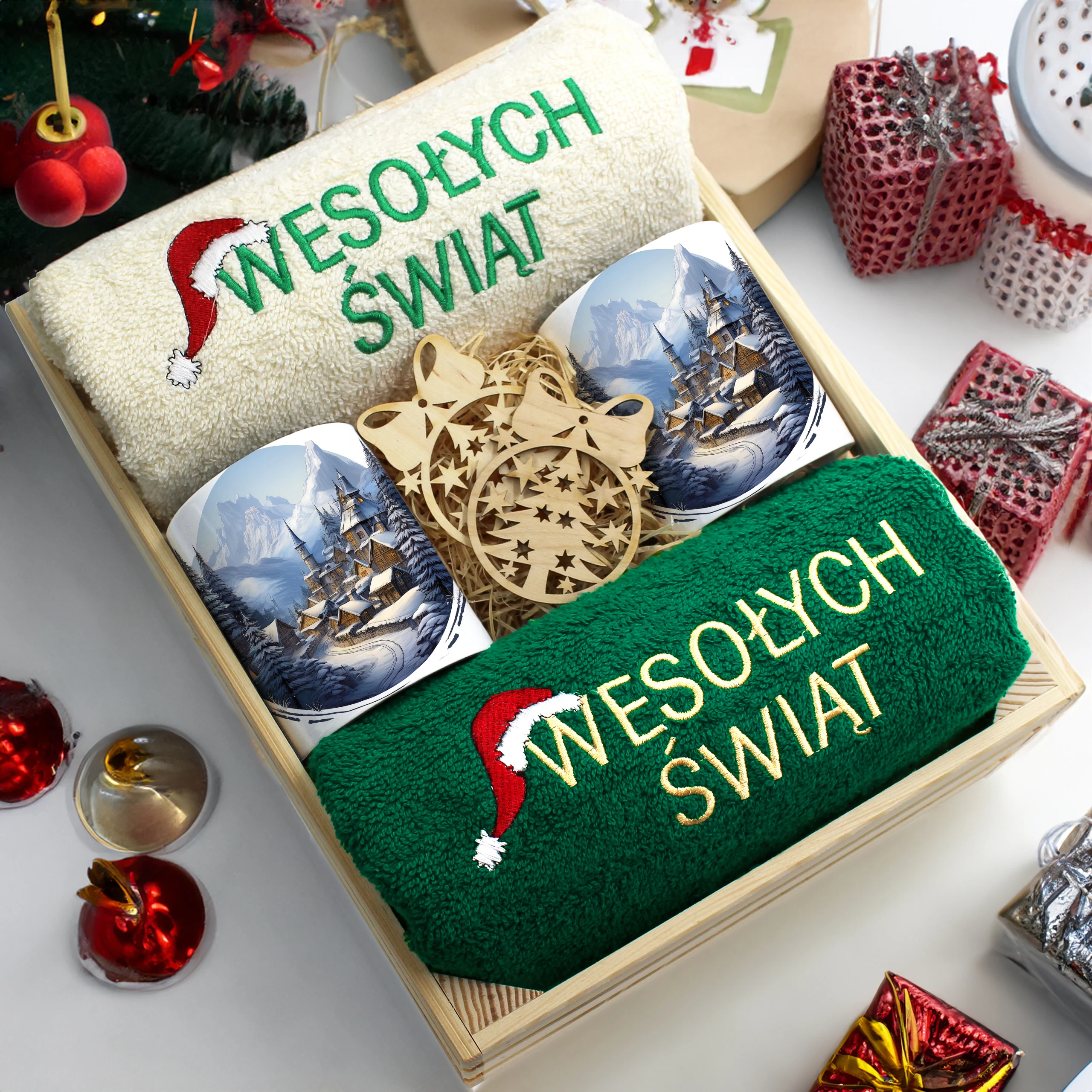 Każdy zestaw ręczników wraz z kubkami jest zapakowany w folię - celofan - zestaw tworzy gotowy prezent do podarowania bez potrzeby dalszego pakowania.